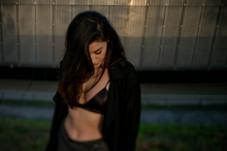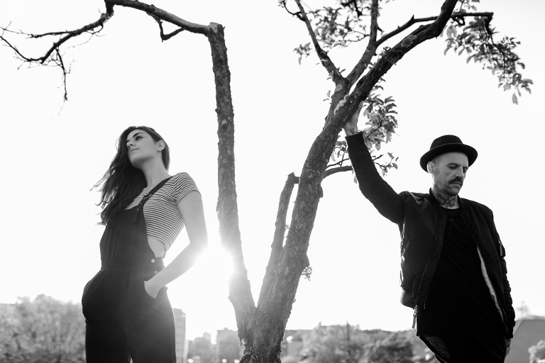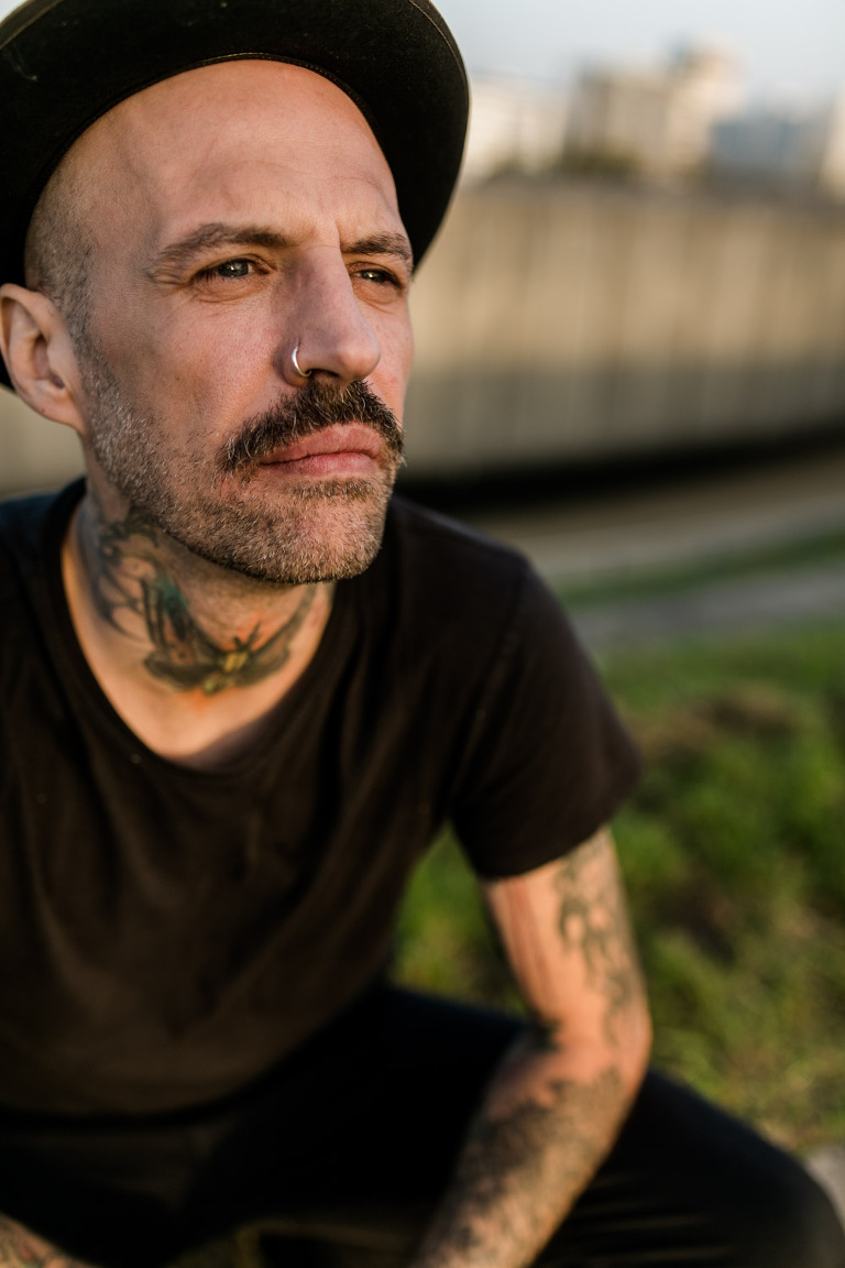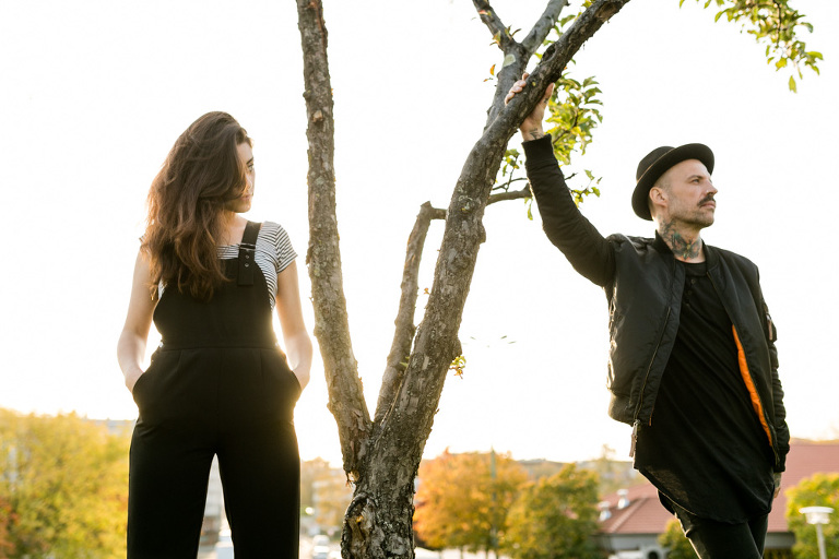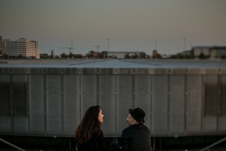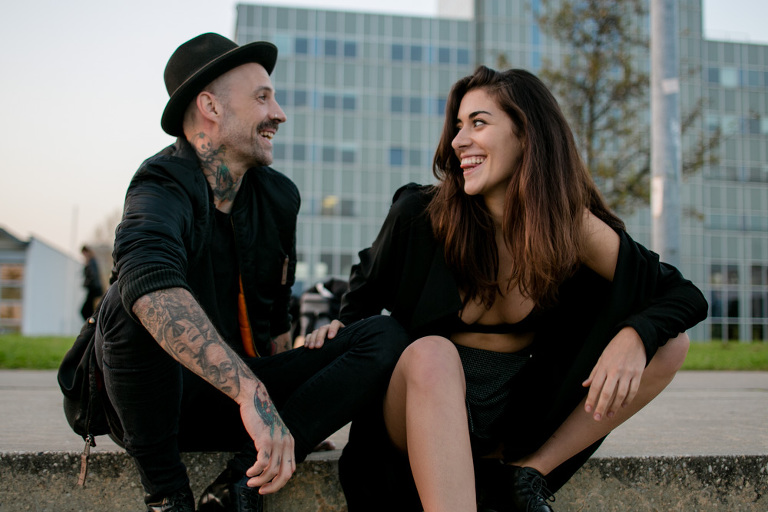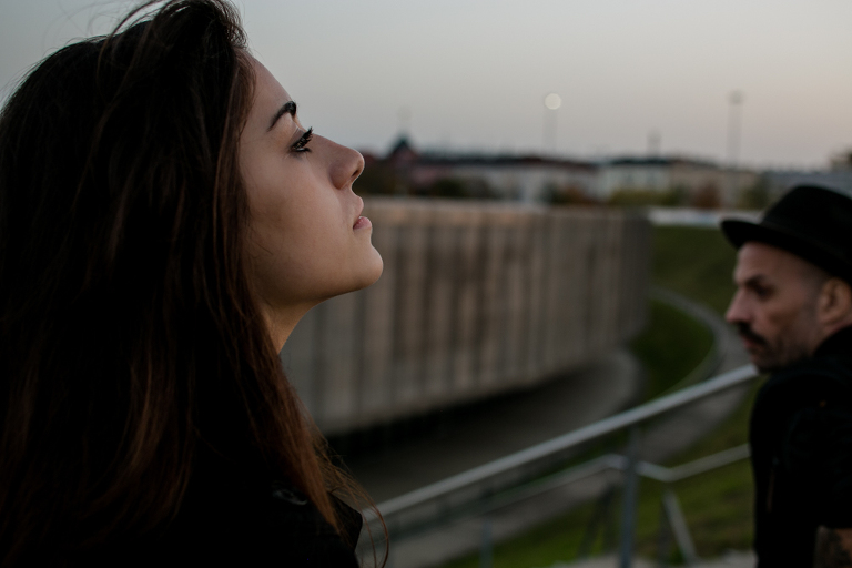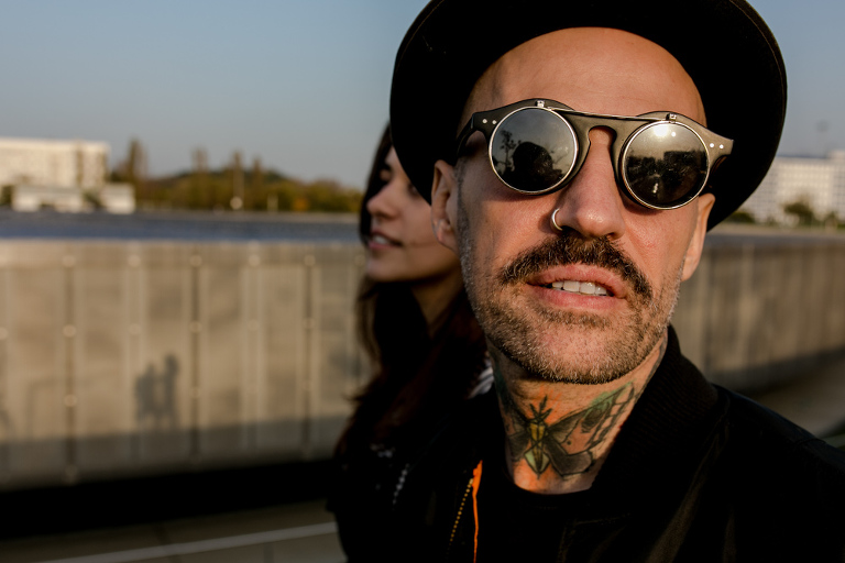 Im Vorfeld der Keep-it-real-Fotografenkonferenz traf ich (Timm) mich nach über fünfzehn Jahren mit meinem alten Buddy Kolja, den ich aus meiner Zeit in Münster kenne. Jetzt lebt er schon lang in Berlin-Friedrichshain und ist eine Art Entrepreneur/Lebenskünstler/Model…und Punk. Er hat schon viele lustige Sachen gemacht: In Münster hat er für Titus-Skateboards gearbeitet und diverse relativ lebensmüde Stunts aufgenommen. Man erinnert sich vielleicht, es war damals die Hoch-Zeit von Jackass… Mit einer Moped-Gang aus Berlin (Team Wolf) ist er nach Transsylvanien gefahren und hat es auf Video festgehalten. Nebenbei war er Model, u.a. für Adidas. Es war schön zu hören, dass es ihm gut geht und er sein Leben liebt. Mitgebracht zum Shooting hat er Natalia, ursprünglich aus Nord-Spanien. Das Velodrom hat es mir mit seinem Ufo-artigen Aussehen angetan und das Abendlicht stand auch perfekt. Manchmal fallen mir Liedtextzeilen oder Gedichte zu Fotos ein, hier passt wohl am Besten „Swing life away“ von Rise against:
