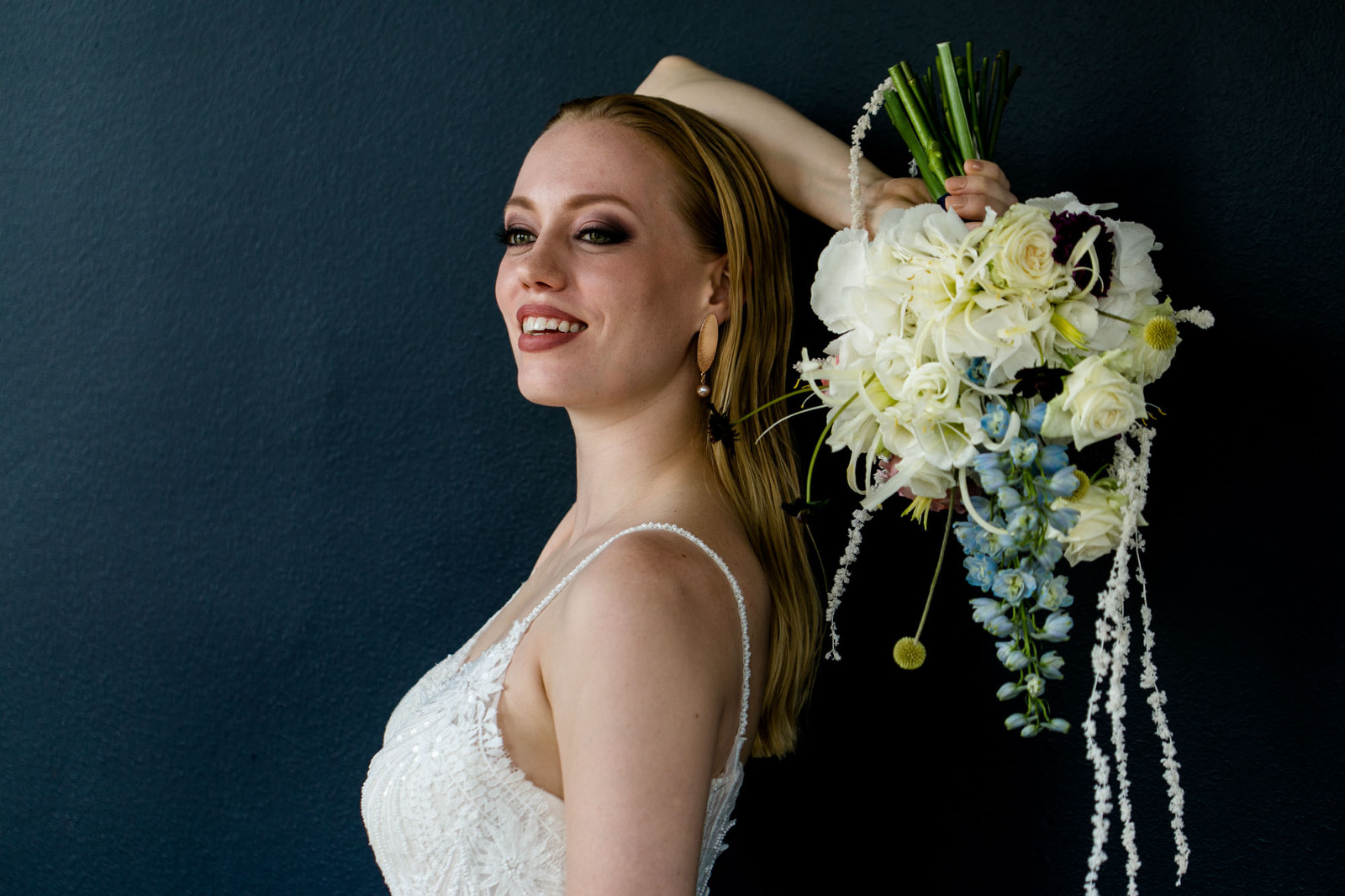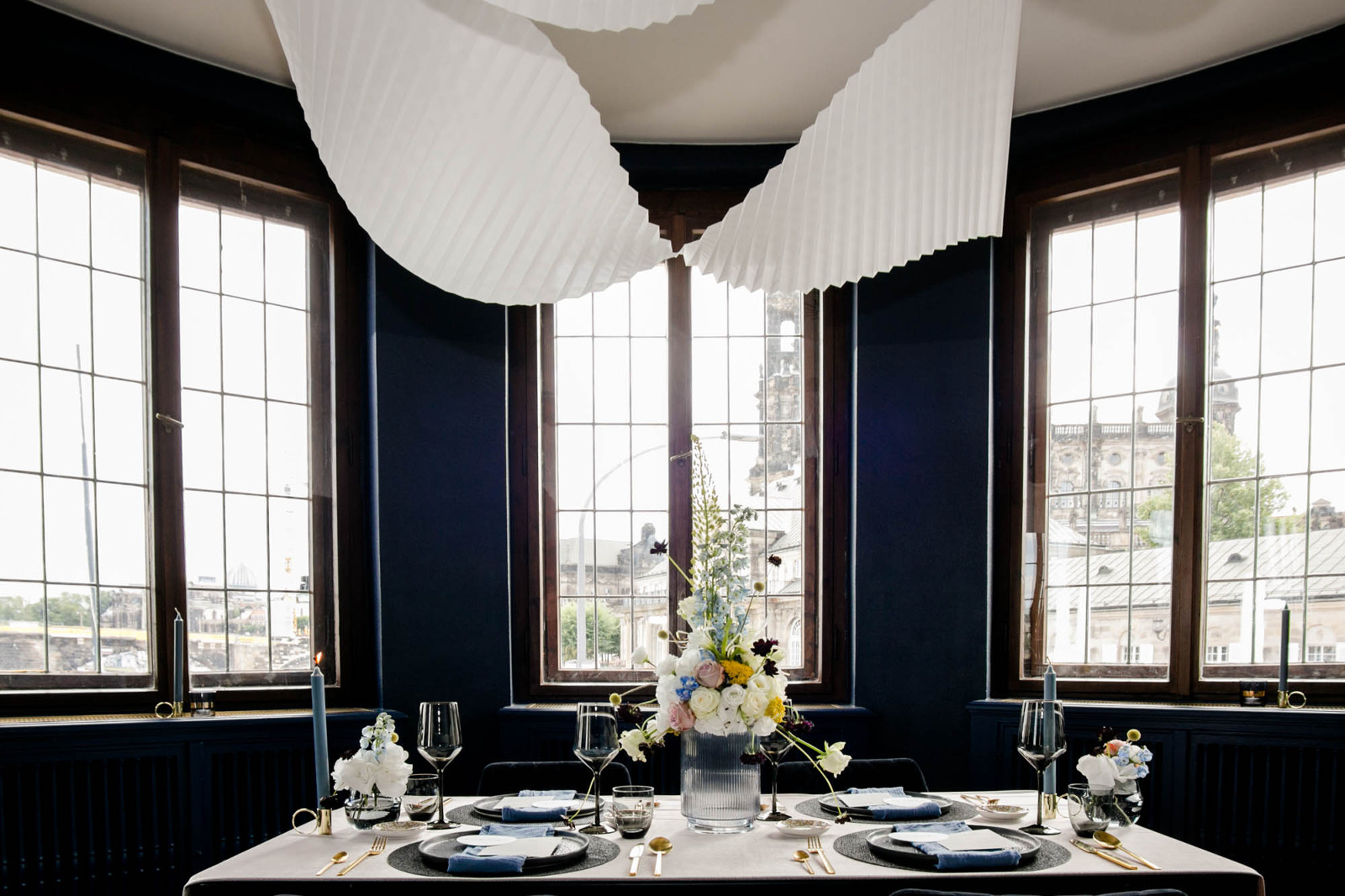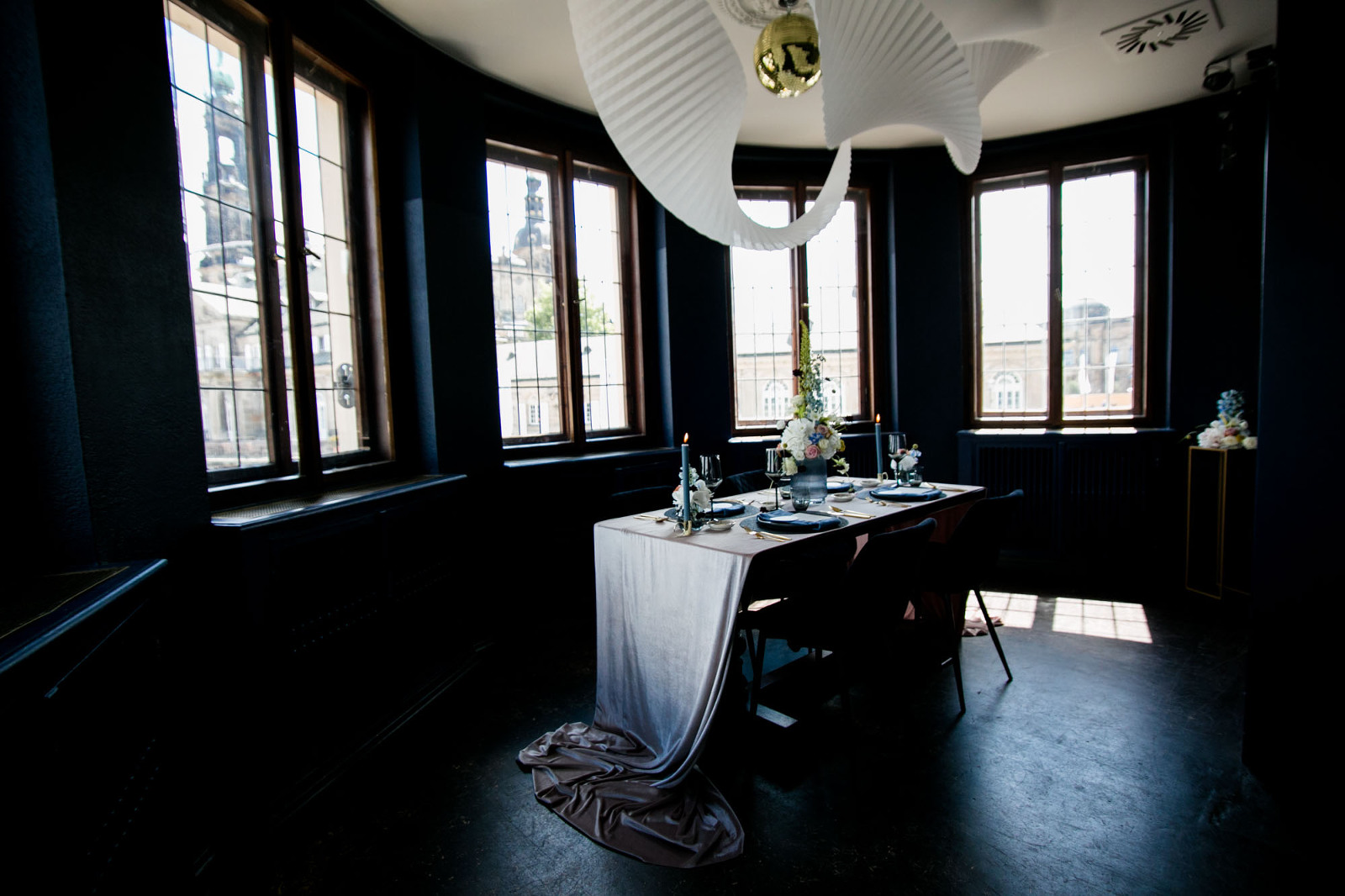 Unsere erste Inspirationsquelle war das Kobalt selbst. Diese coole Atmosphäre im Basteischlösschen mit Wänden in kobaltblau inmitten der historischen Altstadt Dresdens würde auch im wahren Leben Einfluss auf den Stil der Hochzeit nehmen. Wir dachten dabei an eine moderne und extravagante Großstadtbraut und fanden in Aidan Gibson, der Solistin des Semperoper Balletts eine Braut bzw. ein Brautmodel, wie es besser nicht hätte passen können.