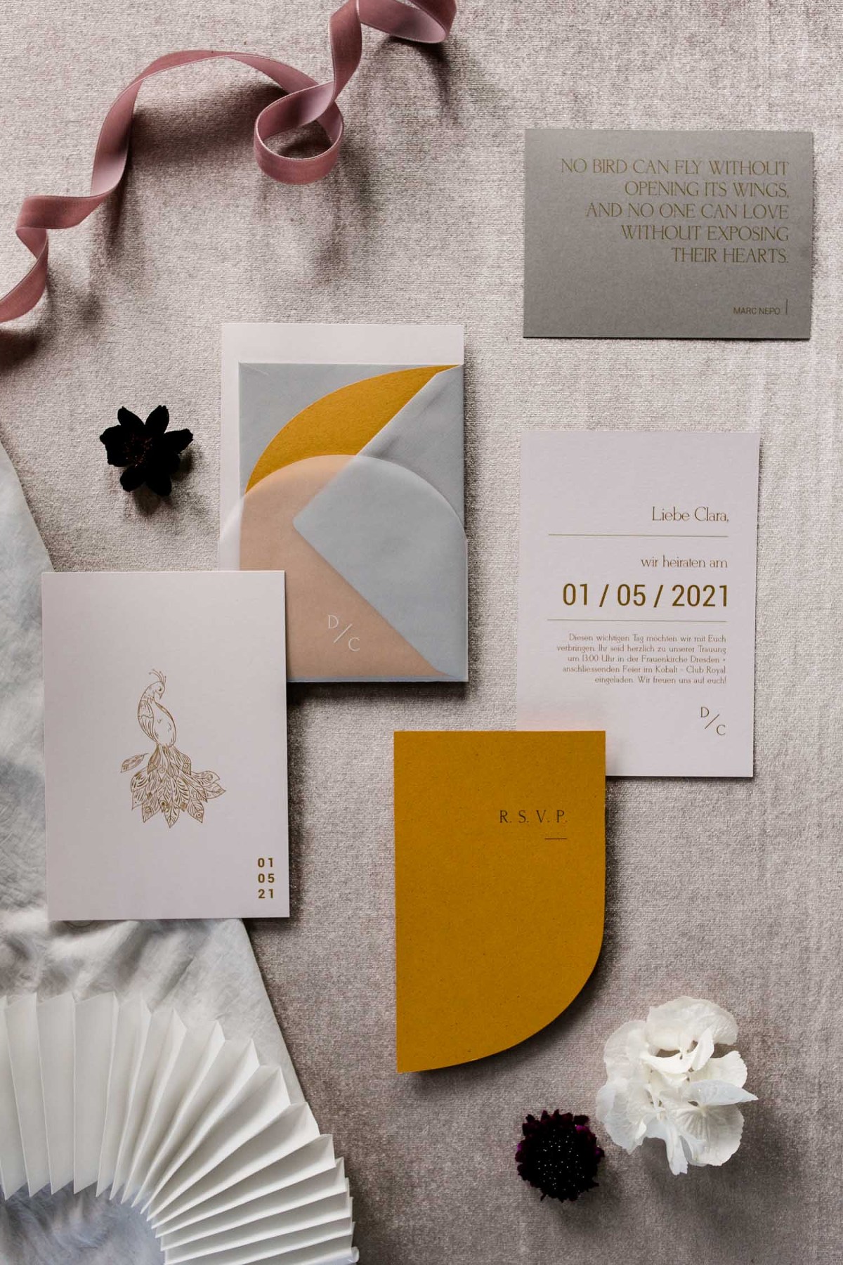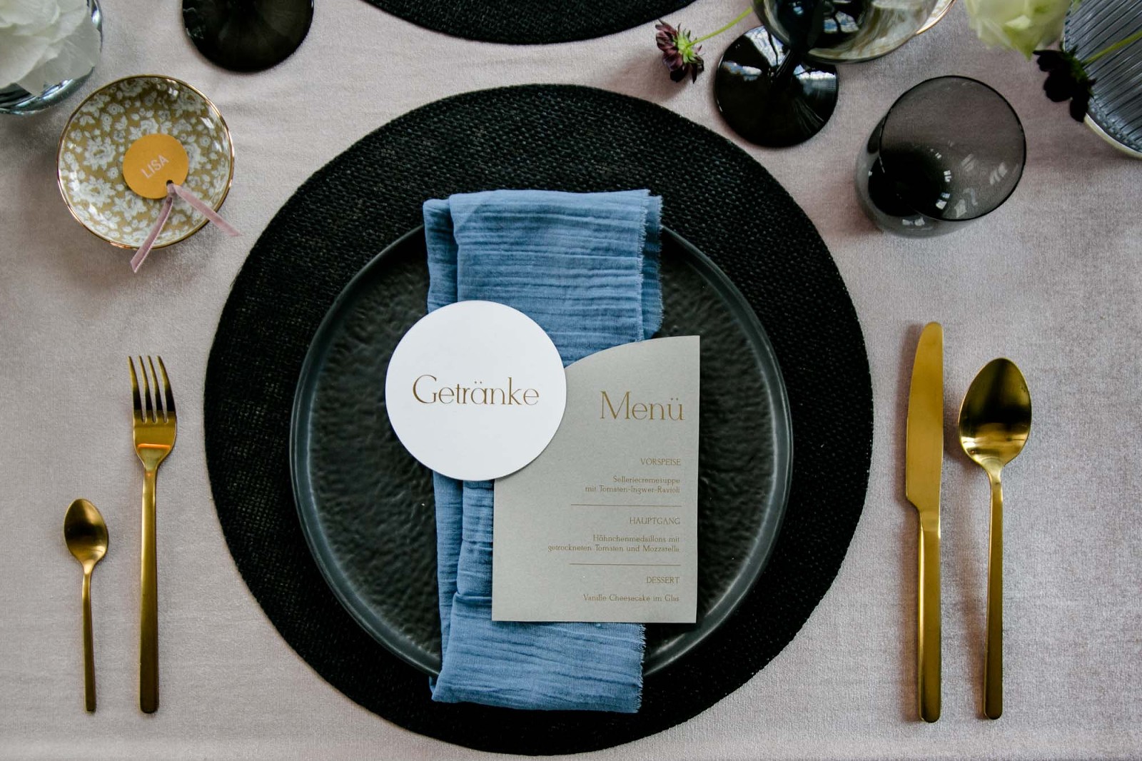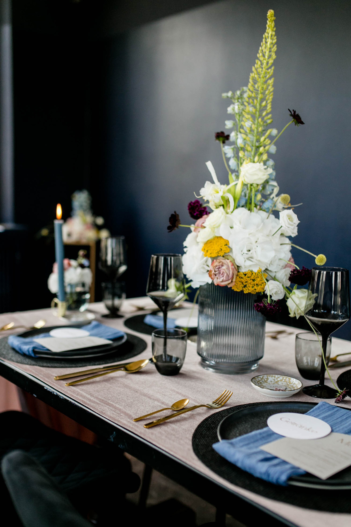 Gemeinsam mit Fabienne Lunden und Astrid Flemming planten wir. Die Farben für Tischdeko und Papeterie mussten mit dem Kobaltblau harmonieren und so kamen wir auf: gold, rose, senfgelb, grau, schwarz und weiß. Den Blumenschmuck und den Brautstrauß gestaltete die Floristikwerkstatt Zauberhaft und die Torte brachte uns MY Cakes & Sweets.