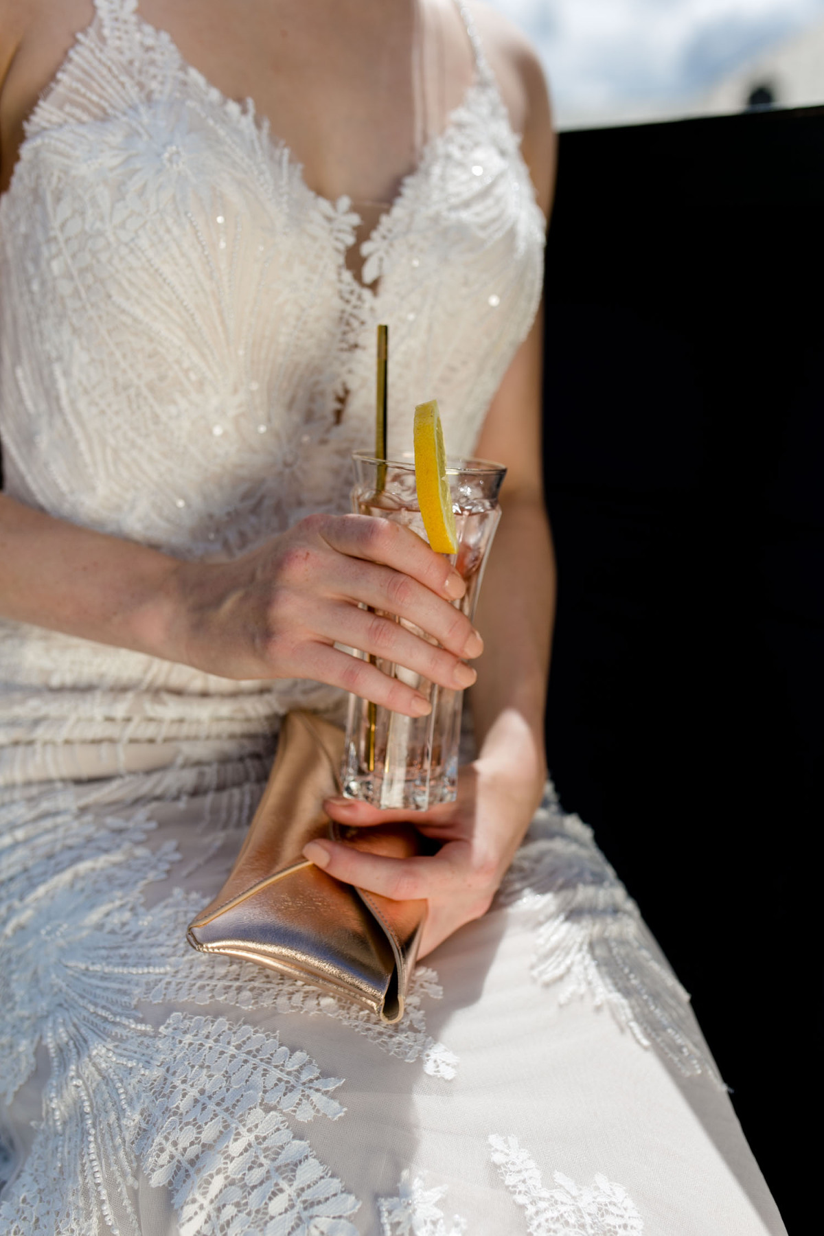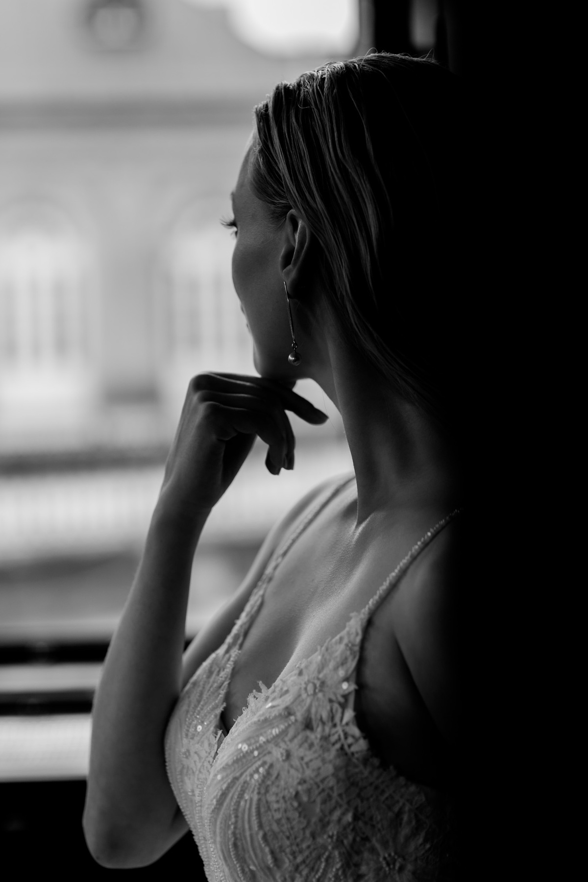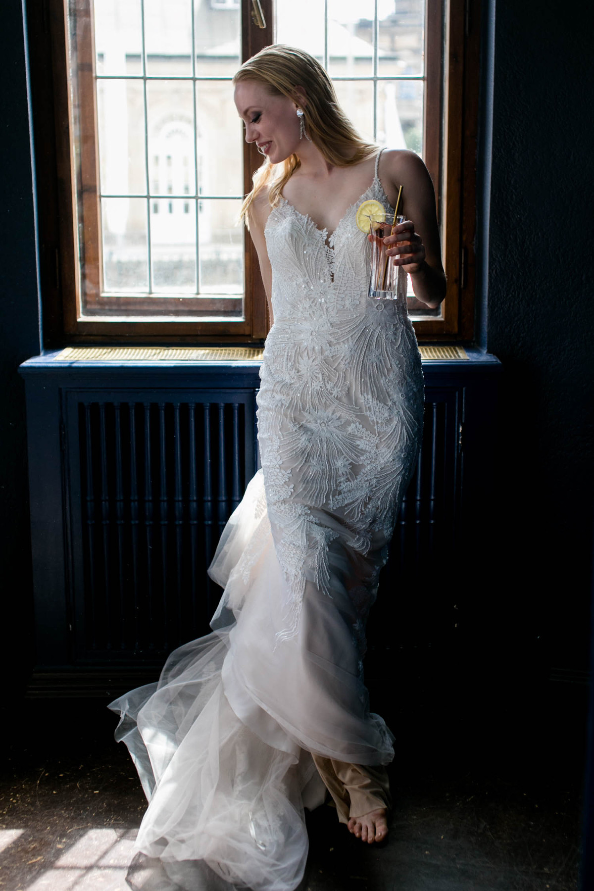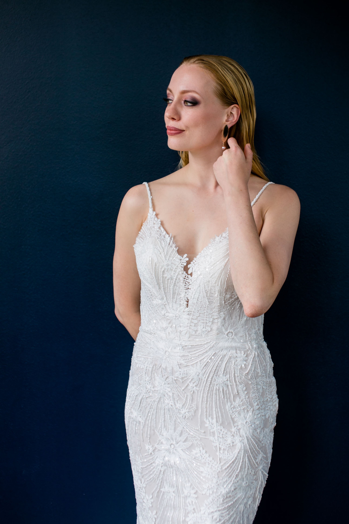 Kleid und Schmuck sollten extravagant und elegant sein, aber eben auch dafür geeignet, bis tief in die Nacht hinein zu tanzen. Wir fanden das Kleid im Wedding Atelier von Die Verheirater und wurden fündig bei Chelleri Jewellery mit sehr besonderen Ohrringen.