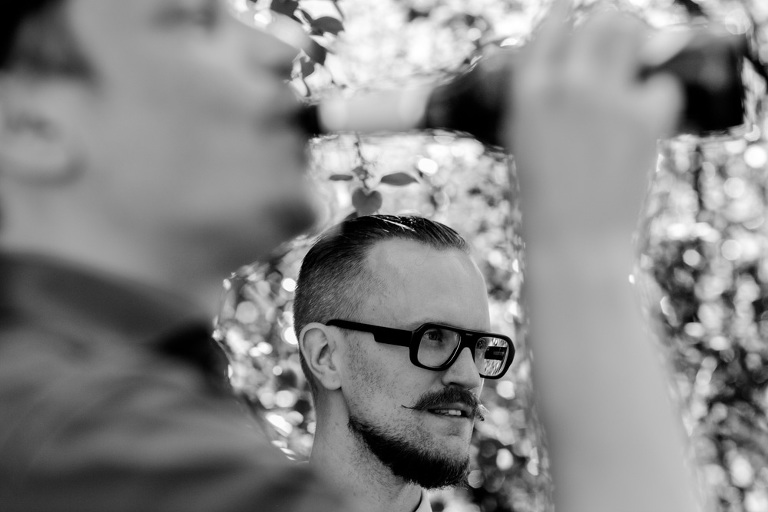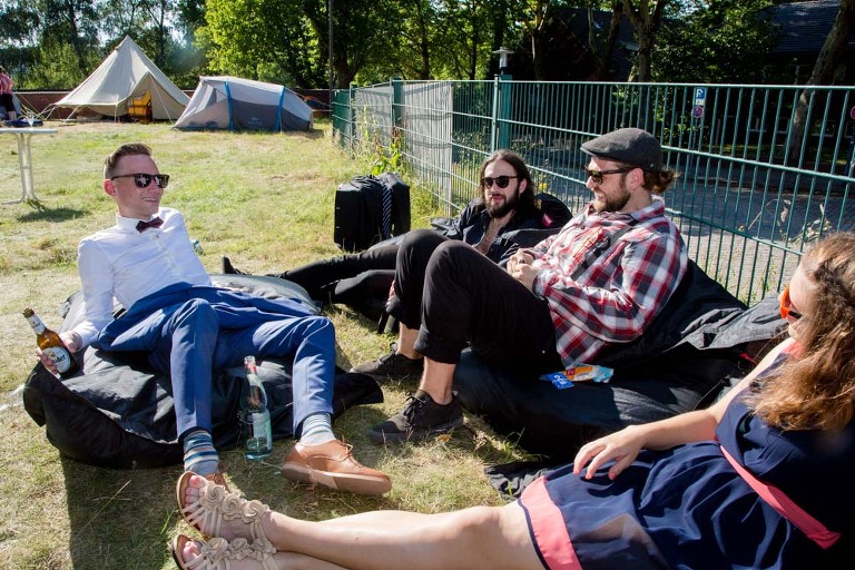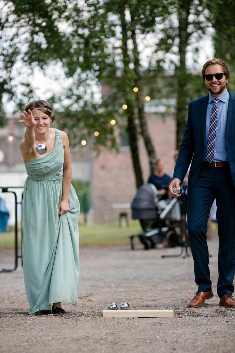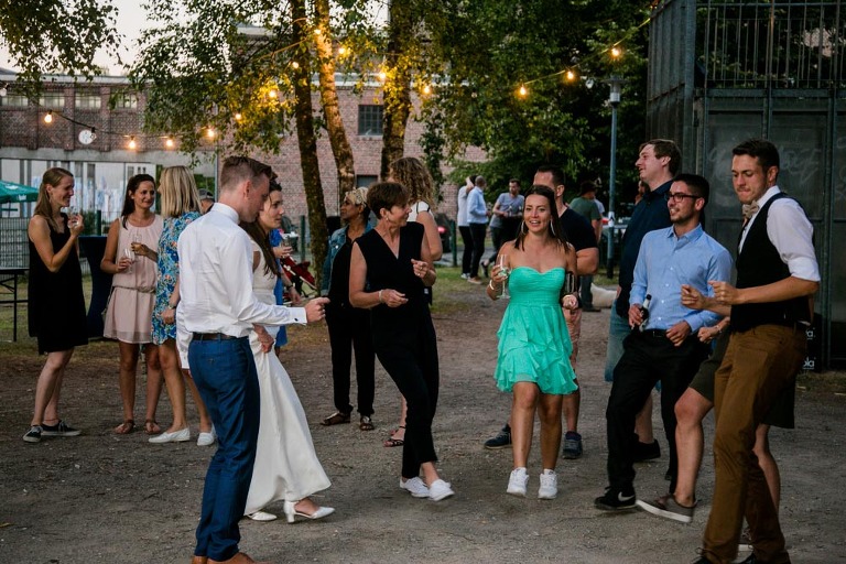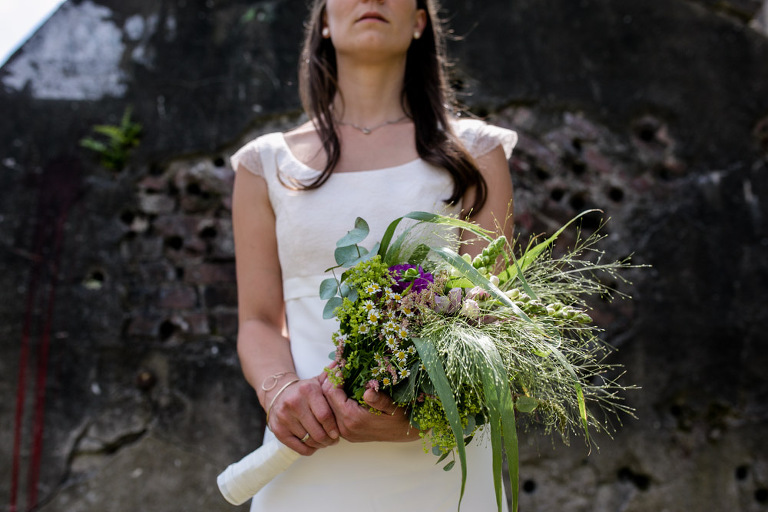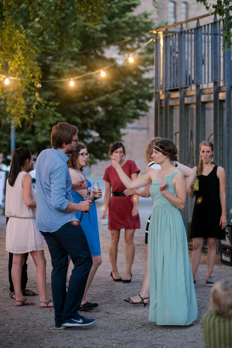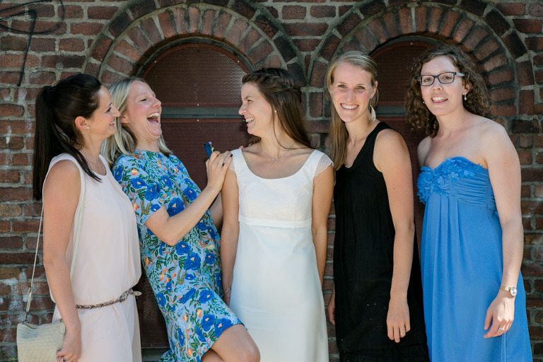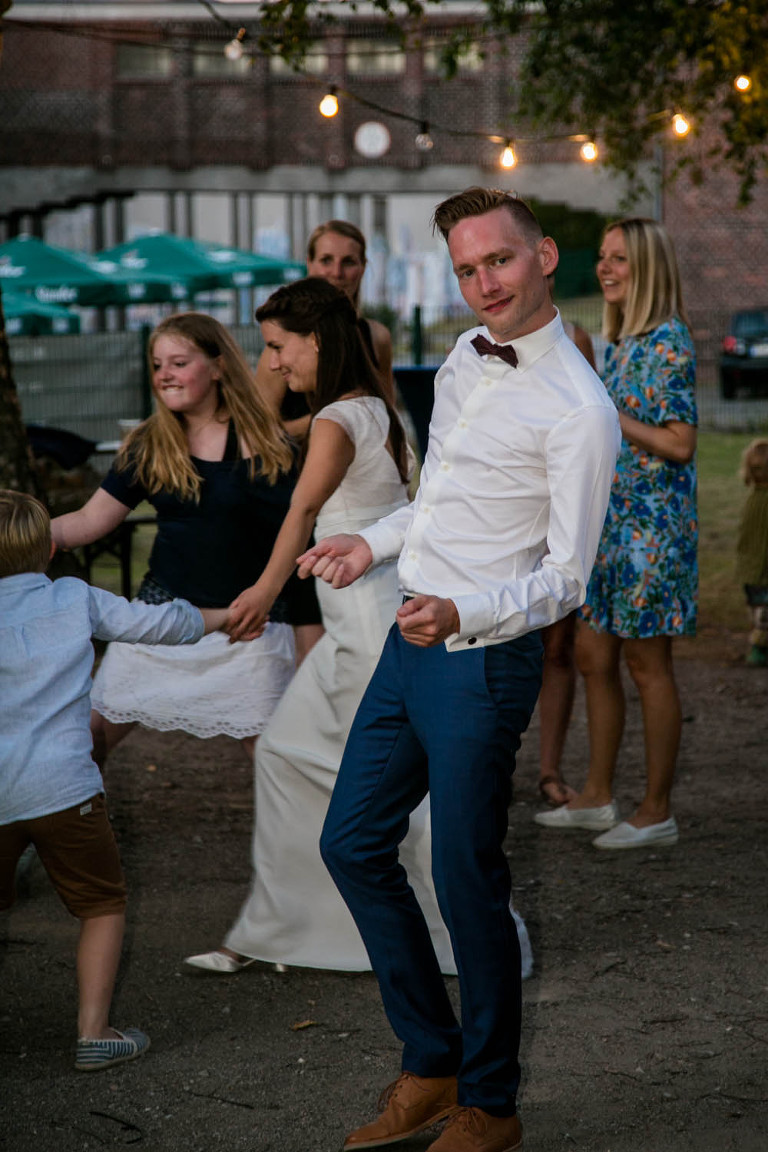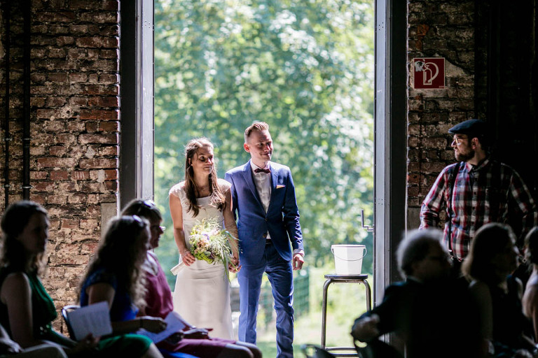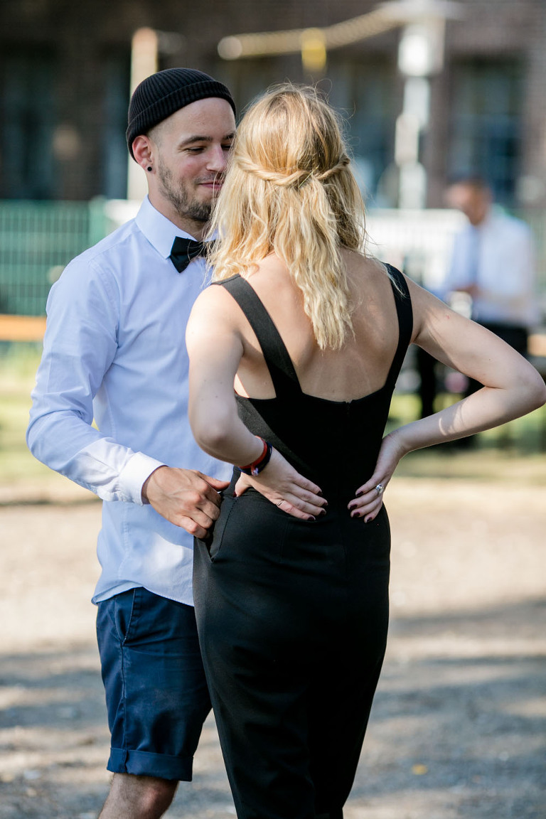 In July I (Timm) drove west to the wedding party of Katja and David, and what a loosened and unconventional wedding party it was! For you to remember, we already did a couple shoot with them on an old airfield. After the getting-ready in their Bochum home we moved over to the Zeche Carl in Essen, an old industrial estate turned into a museum, where there was enough space for the wedding service, the chillout zone in the garden and the dance action in the basement. The church ceremony was led by Matze who once wed us. With Ben, the preacher, Timm had been doing music a lot and the swinging Americana music in the service came from the „Die ehrlichen Arbeiter“. So it was a big friend`s gathering also for Timm. After a couple shooting in the backyard of the estate and a very relaxed afternoon in the garden there was a Barbecue made out of a food van! The first dance was embedded in everyone`s danceparty later. And our photobooth was used extensively. Wow!
