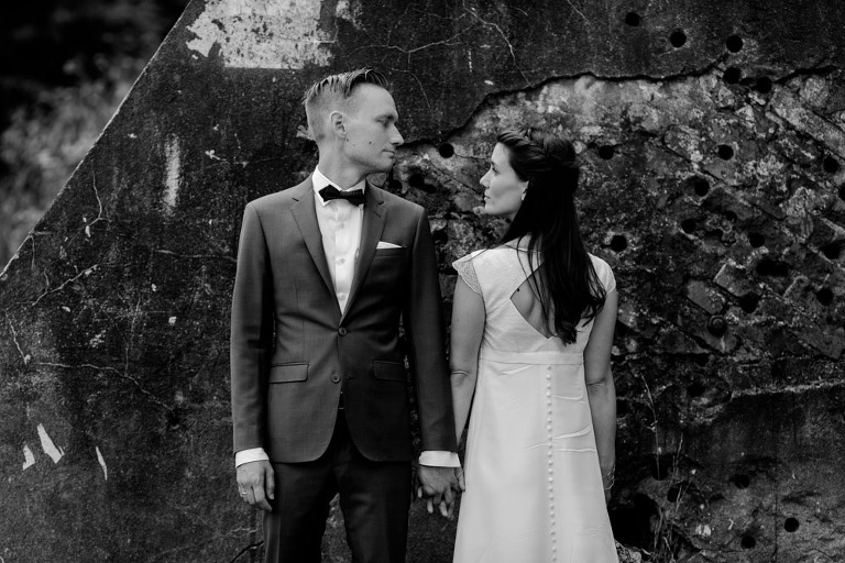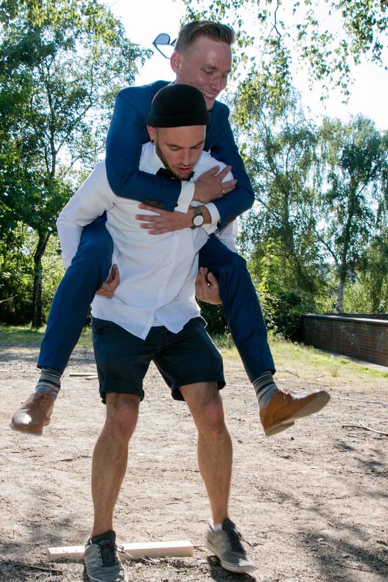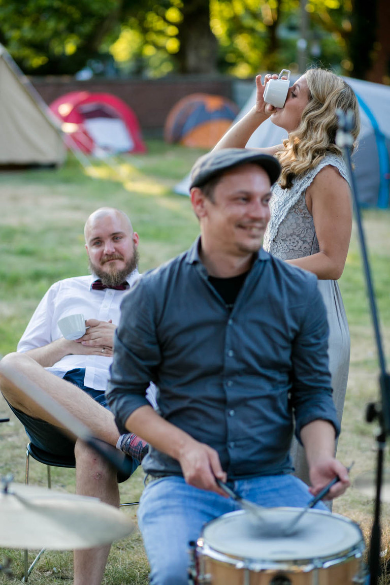 Im Juli fuhr ich (Timm) nach Bochum in den Ruhrpott zu Katja und David`s Hochzeit. Was für eine ausgelassene unkonventionelle Party war das! Vielleicht kommen Euch die Gesichter bekannt vor: Wir hatten mit den zweien schon einmal auf Paarshooting auf einem alten Flugplatz. Nach einem entspannten Getting-Ready in ihrer Bochumer Wohnung ging es zusammen mit Sohn Levi in die Zeche Carl in Essen, einem Industriedenkmal mit genug Raum für den Traugottesdienst, fürs Chillen im Garten und fürs Tanzen später im Keller. Die freie Trauung leitete unser Freund Mattse, der damals unsere Traupredigt hielt. Und mit Trauredner Ben hatte ich lange Musik gemacht – auch auf unserer eigenen Hochzeit. Der swingige Americana-Sound im Gottesdienst kam von den „ehrlichen Arbeitern„. Es war also für mich ein großes Freundetreffen. Nach einem ausgiebigem Shooting hinter der Zeche und einem entspanntem Nachmittag gab es leckeres Gegrilltes aus einem Foodtruck. Der Hochzeitstanz fand dann auch zusammen mit den Gästen im Garten zu DJ-Sound statt. Und unsere Fotobox wurde auch eifrig genutzt. Hach!