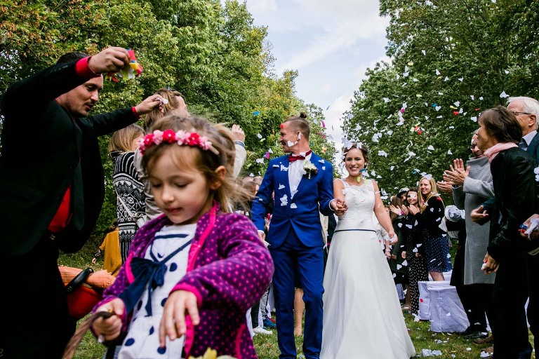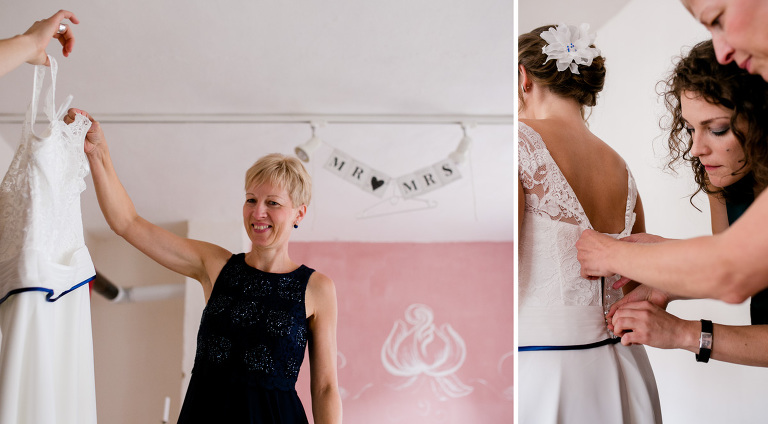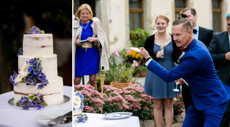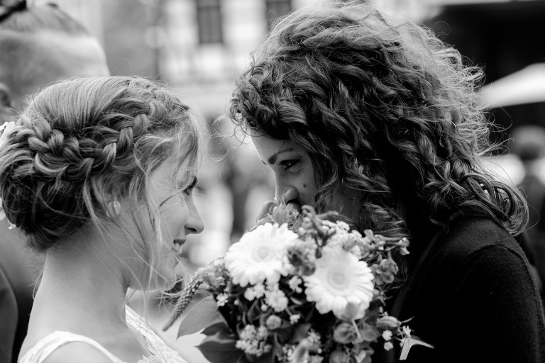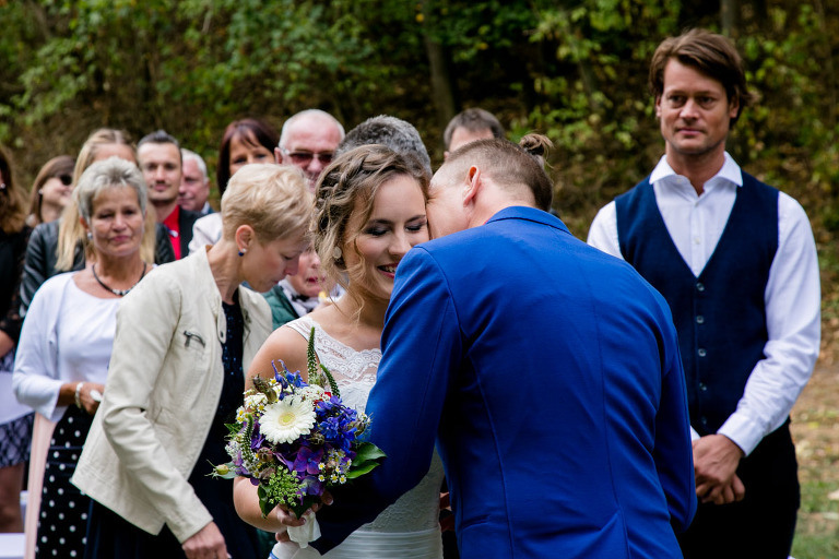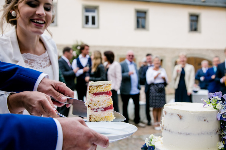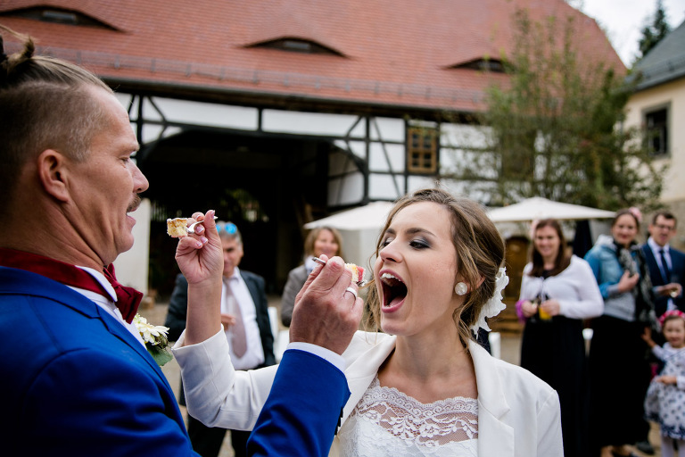 Es war auch klar, dass fast alle Dienstleister an diesem Tag aus ihrer Hood, der Dresdner Neustadt kamen: Thomas‘ herrlich blauer Anzug stammt von Anders & Anders, Nadine Kaiser und ihr Team kümmerten sich um Haare und Make Up von Theresa, den Brautstrauß gestaltete In Bluete , die Ringe wurden von Patrice von ultramaringelb geschmiedet und die leckere Hochzeitstorte stammt von Fräulein Lecker. Theresas elegantes Kleid kaufte sie allerdings weiter weg – in Leipzig im Barockoco :-).