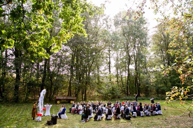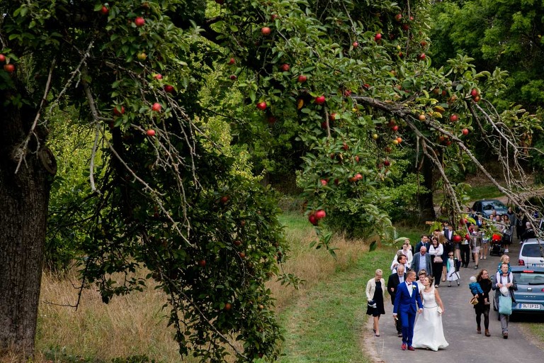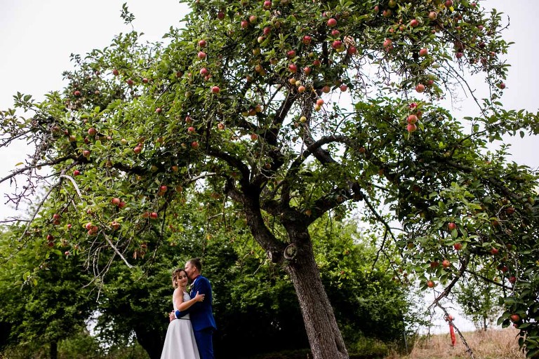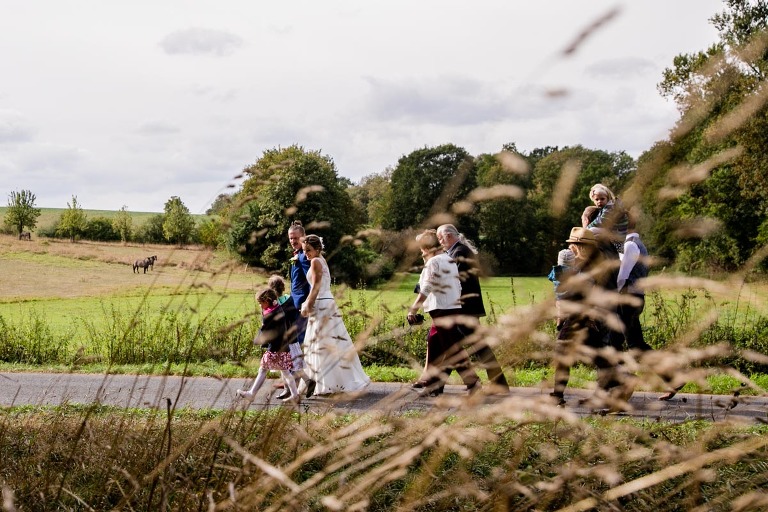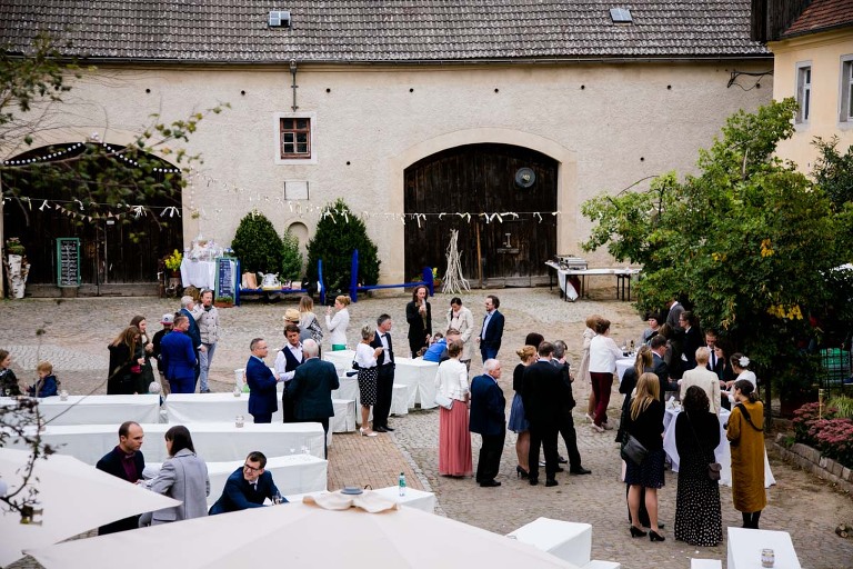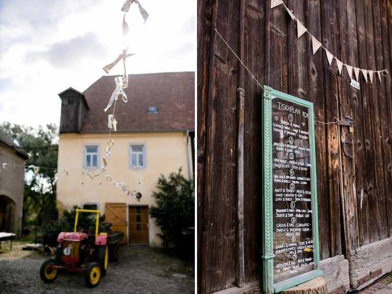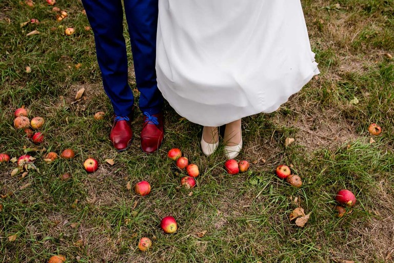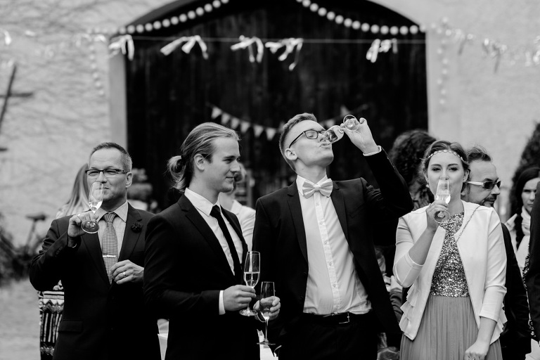 Die Freie Trauung fand auf einem Wiesenstück einige hundert Meter weiter statt – bei herbstlich frischem Septemberwetter inmitten der Natur. Ich werde nie vergessen wie Theresa mit heiserer Stimme für Thomas sang und den letzten Teil des Liedes sprechen musste, weil ihre Stimme nicht mehr mitmachte. Danach gab es einen fröhlichen Brautzug zur Scheune mit einer laangen Schlange von Gratulanten. Im Inneren des Vierseitenhofes stießen alle auf das Brautpaar an, es gab leckerste Torte und amüsante Einlagen des Brautpaares. Ach, und eine wilde Mischung an Fotos sind bei unserem Paarshooting noch entstanden, bei dem ich es nicht lassen konnte, neben Timm auch noch etwas mitzufotografieren. Die Kinder rannten ausgelassen über den Hof und zu später Stunde wurde gesungen, getanzt, gespielt oder entspannt am Lagerfeuer gesessen.