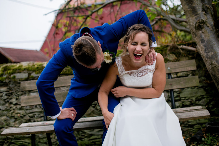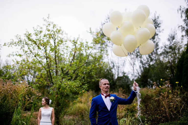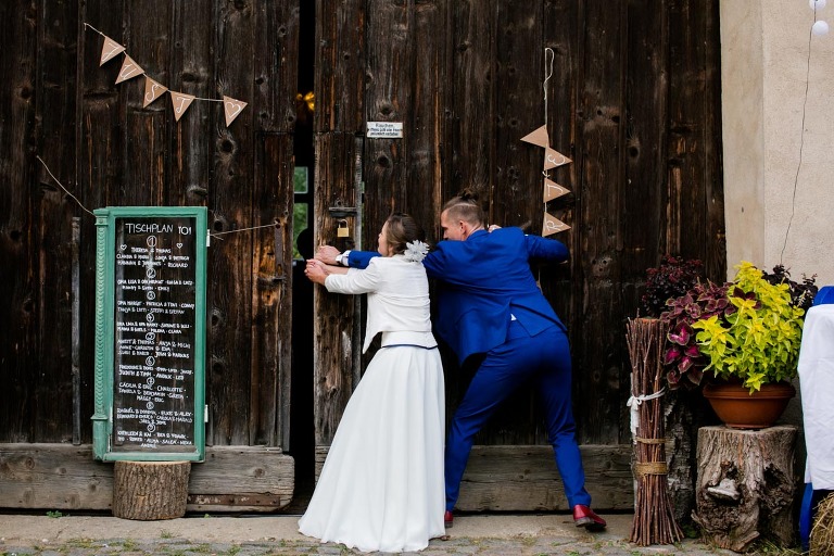 They celebrated their wedding day in the village of Auterwitz in a farmyard and attached barn, rustical, simple and cozy. Many friends contributed in some way or another and mostly all of the vendors are based in the alternative Neustadt neighbourhood of Dresden. The ceremony took place on a lawn a few hundred meters away, and I will never forget Theresa singing a self-composed song for Thomas, partly having to speak the words due to her breaking voice. Then everybody wandered to the yard for congrats and cake. At the couple shoot a wild mixture of photos were made by Timm and me, from (overtly) serious to outraged funny…