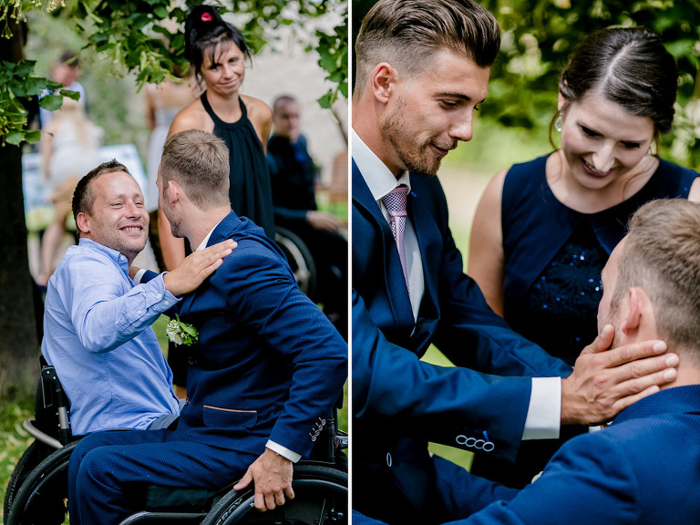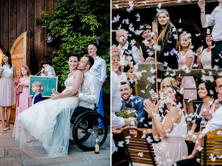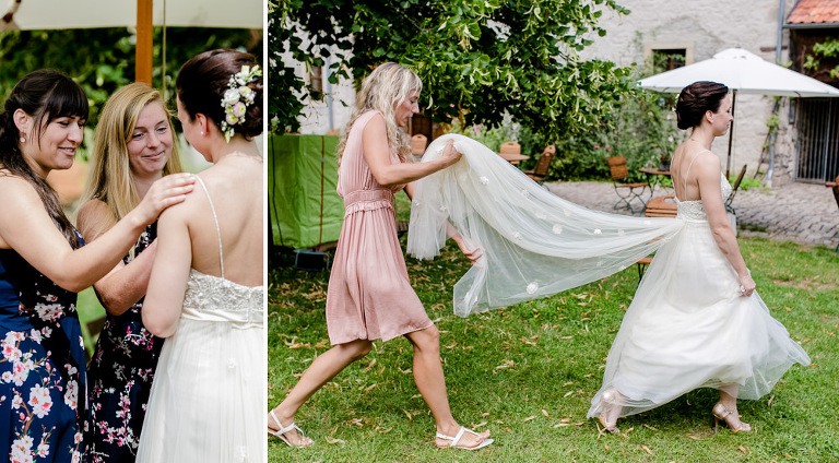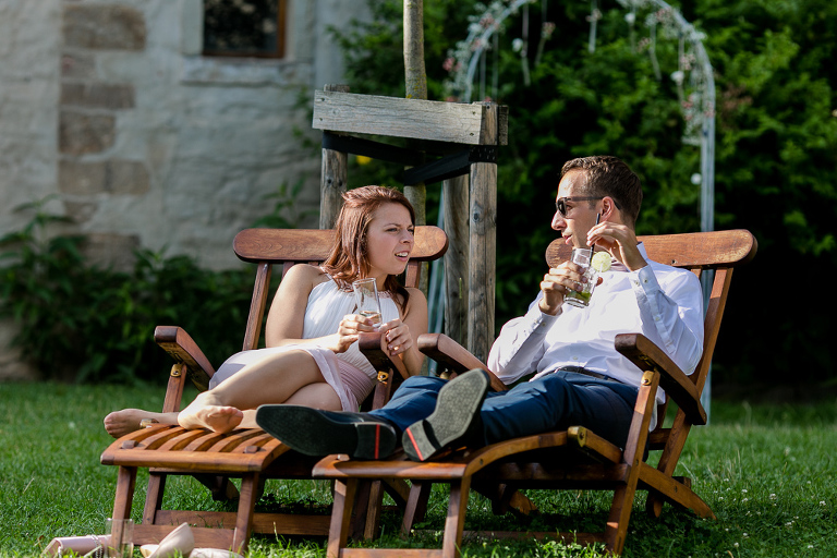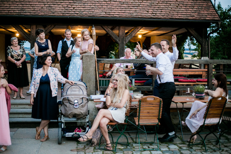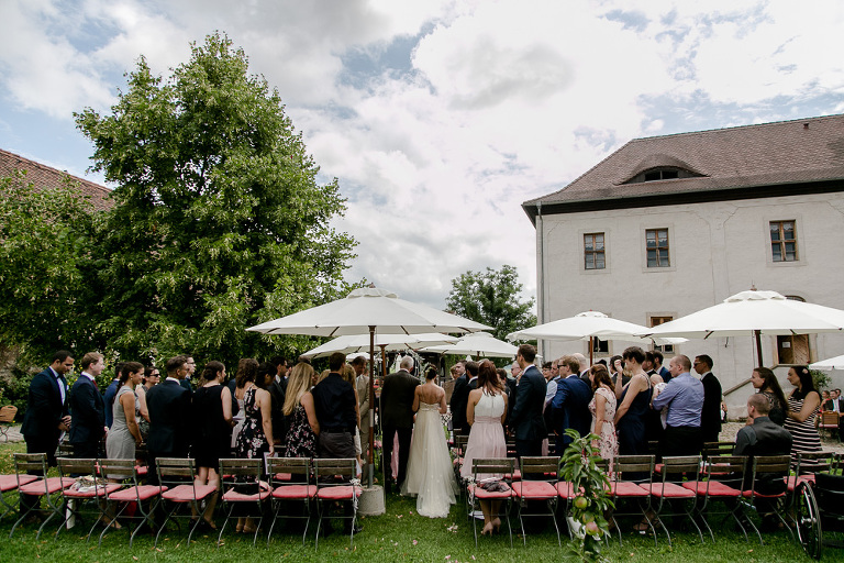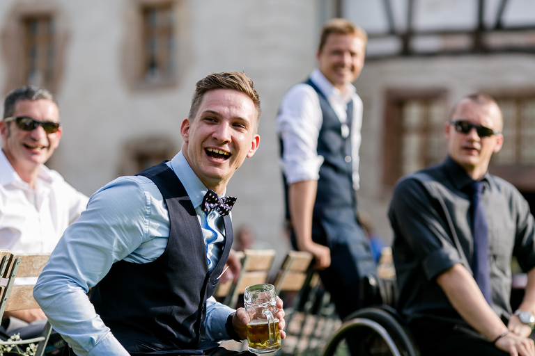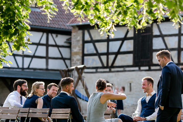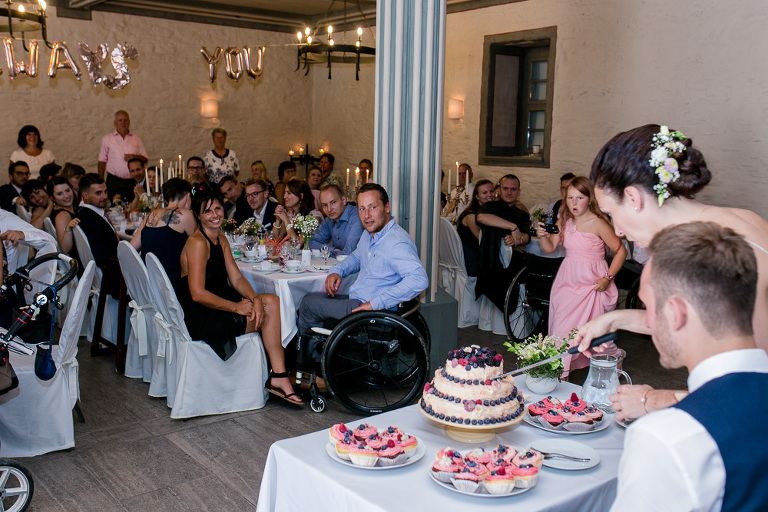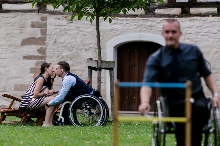On the next day I started photographing the getting ready of bride and groom and off it went to the free ceremony in the courtyard. After very moving speeches from a friend of them and from Marcus‘ father, both recalling how Stephanie and Marcus got together after his accident, tears were flowing all over the place. Not easy to cover those moving moments properly when tears are between your eye and the viewfinder… They both are such optimistic and funny people and display a joy of life. You can sense that in the group pictures especially. After his accident Marcus made it into the national paralympics team for Basketball. After a relaxed afternoon with different games and cocktails there was the awesome Buffet with a concluding ice cream bombe. On the next morning I sat between the bridal couple and relatives at the breakfast table and it felt again that through such an including of the wedding photographer in the wedding society the best pictures are evolving. Hopefully you can see it, too.