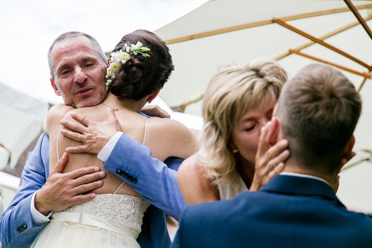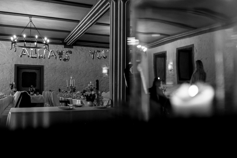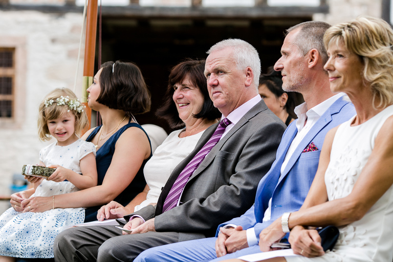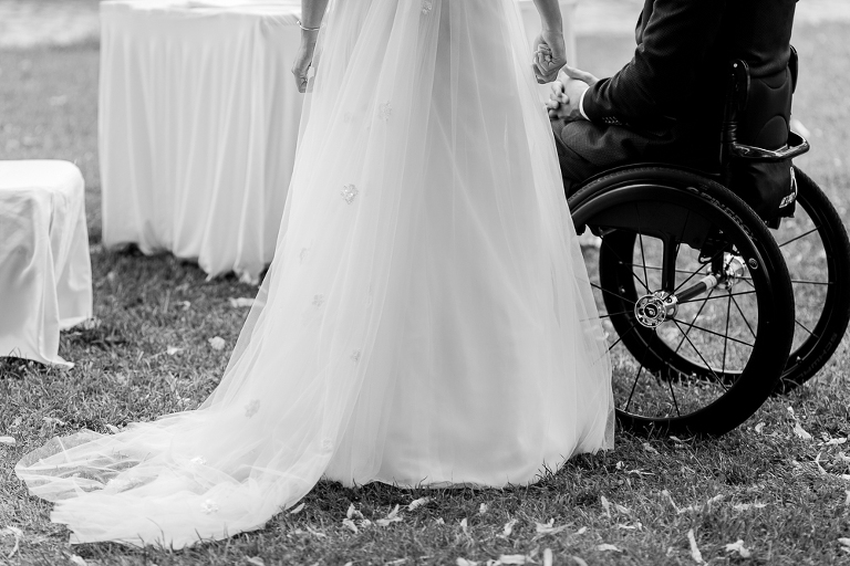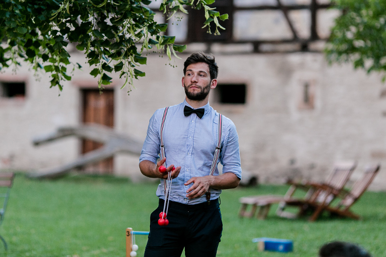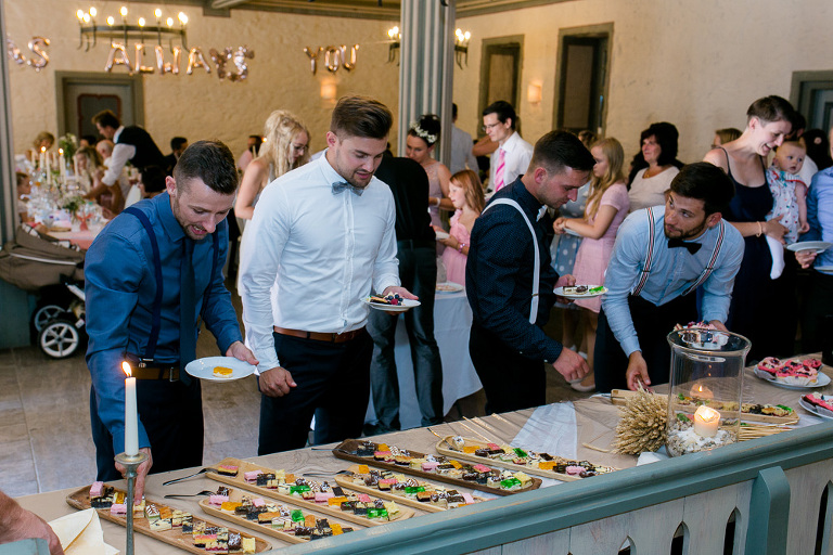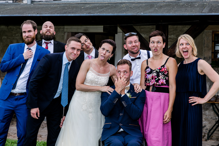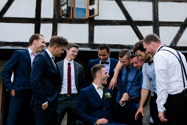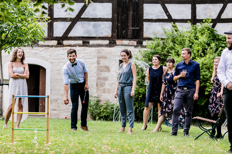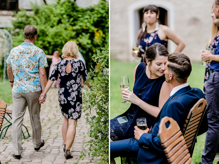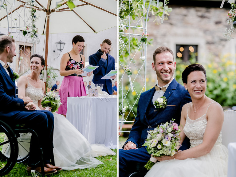 On the next day I started photographing the getting ready of bride and groom and off it went to the free ceremony in the courtyard. After very moving speeches from a friend of them and from Marcus‘ father, both recalling how Stephanie and Marcus got together after his accident, tears were flowing all over the place. Not easy to cover those moving moments properly when tears are between your eye and the viewfinder… They both are such optimistic and funny people and display a joy of life. You can sense that in the group pictures especially. After his accident Marcus made it into the national paralympics team for Basketball. After a relaxed afternoon with different games and cocktails there was the awesome Buffet with a concluding ice cream bombe. On the next morning I sat between the bridal couple and relatives at the breakfast table and it felt again that through such an including of the wedding photographer in the wedding society the best pictures are evolving. Hopefully you can see it, too.