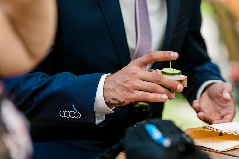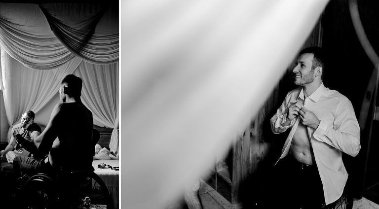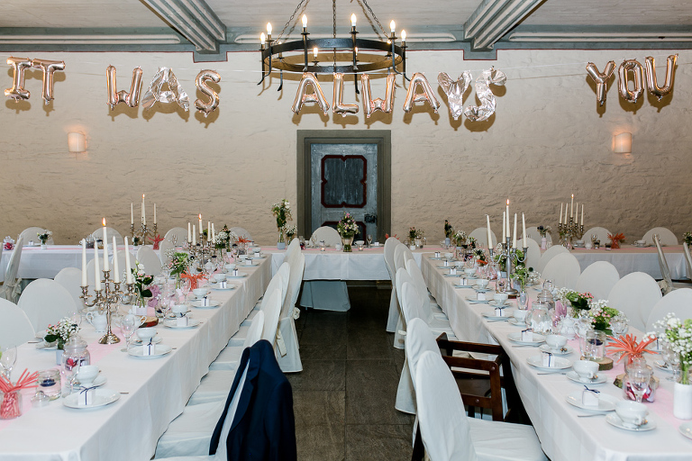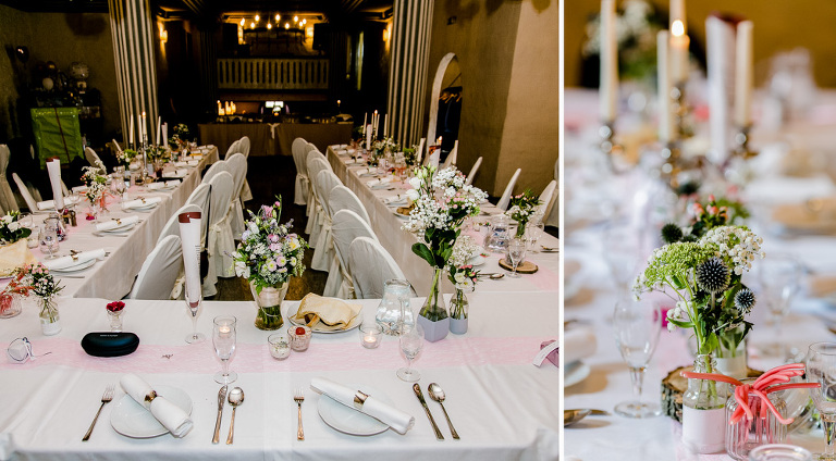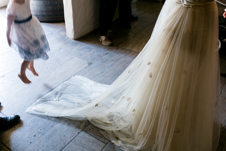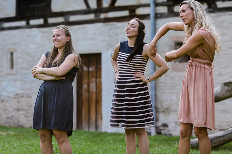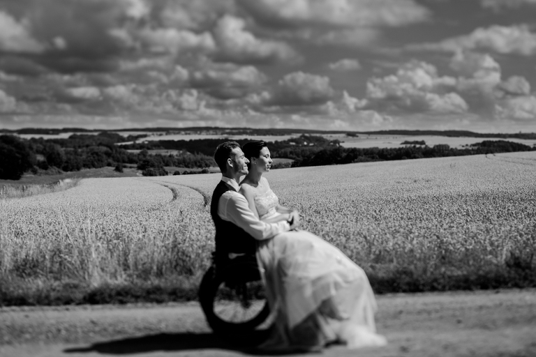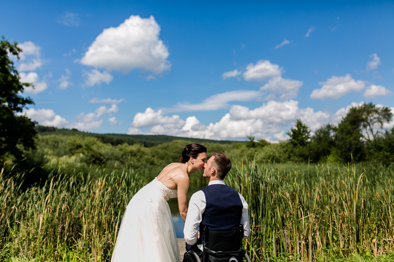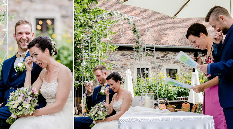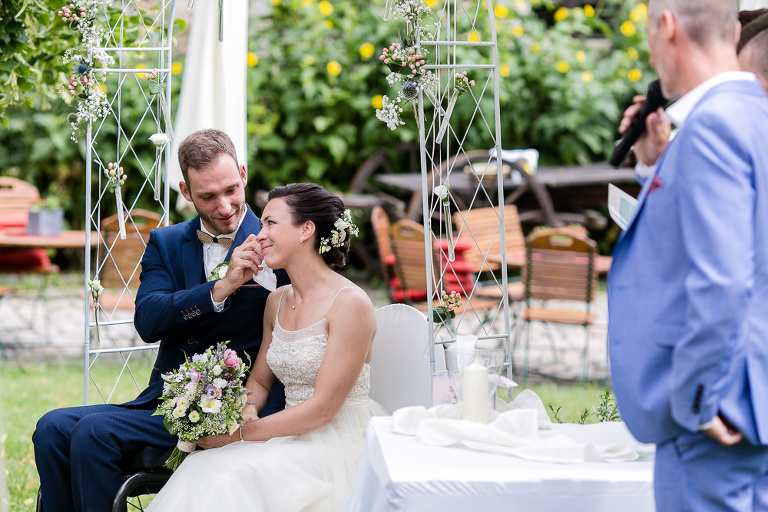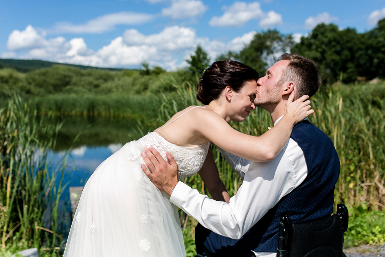 On the next day I started photographing the getting ready of bride and groom and off it went to the free ceremony in the courtyard. After very moving speeches from a friend of them and from Marcus‘ father, both recalling how Stephanie and Marcus got together after his accident, tears were flowing all over the place. Not easy to cover those moving moments properly when tears are between your eye and the viewfinder… They both are such optimistic and funny people and display a joy of life. You can sense that in the group pictures especially. After his accident Marcus made it into the national paralympics team for Basketball. After a relaxed afternoon with different games and cocktails there was the awesome Buffet with a concluding ice cream bombe. On the next morning I sat between the bridal couple and relatives at the breakfast table and it felt again that through such an including of the wedding photographer in the wedding society the best pictures are evolving. Hopefully you can see it, too.