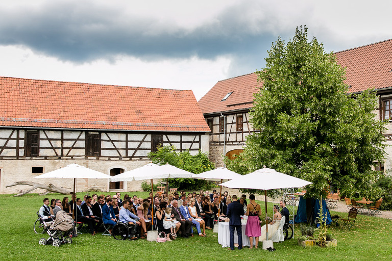 Wow! Wie emotional kann eine Hochzeit sein ?! Die Messlatte liegt nach dieser hier sehr hoch. Aber von vorne: Im Juni war ich (Timm) unterwegs in Thüringen, um die Hochzeit von Stephanie und Marcus zu begleiten. Sie feierten im Rittergut Positz, einem schönen Vierseitenhof mitten in sanft fliessenden Hügeln. Bereits am Freitag hatten die Zwei zu einem entspannten Get-Together eingeladen, damit die von weither angereisten Freunde und Verwandte in Ruhe ankommen können. Für mich war es toll, das Brautpaar, was ich bisher nur von Skype kannte, endlich echt und in Farbe zu sehen und alle Gäste konnten sich auch schon mal mit einer ständig präsenten Kamera aklimatisieren… Es gab ein gutgelauntes Picknick mit Bier und Laugengebäck. Schon hier fiel mir der herzliche und entspannte Umgang aller Verwandten und Freunde miteinander auf.