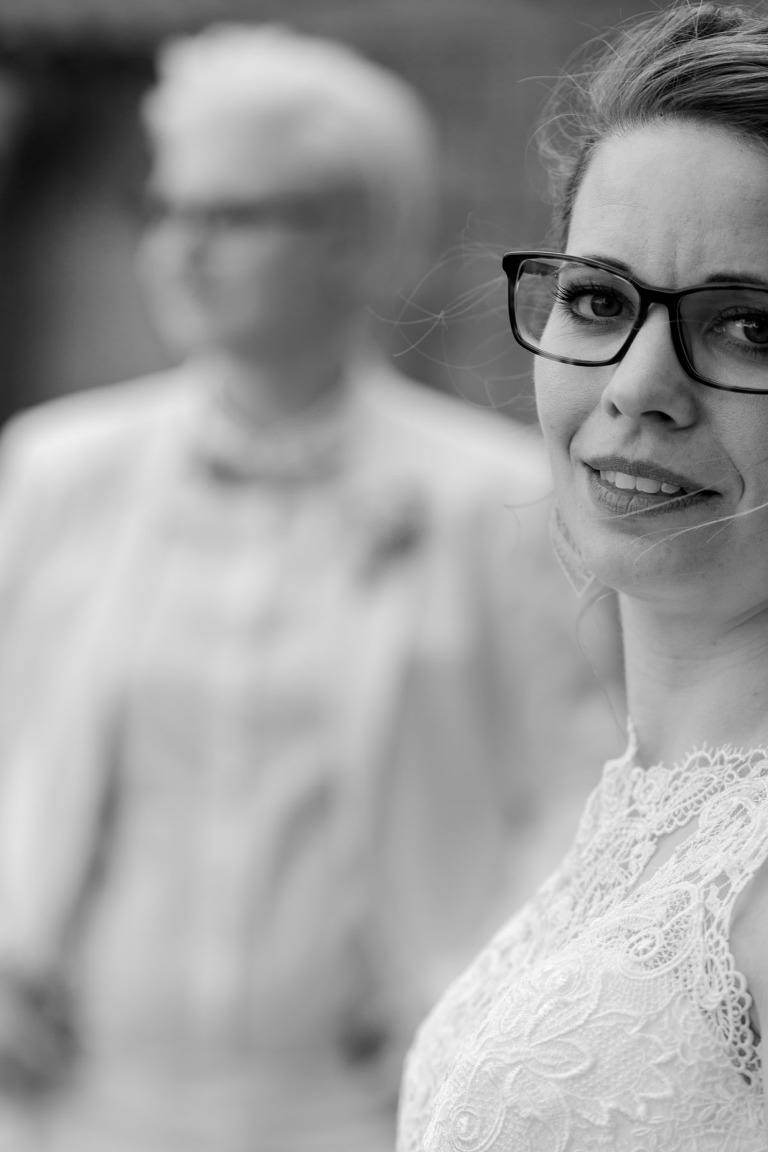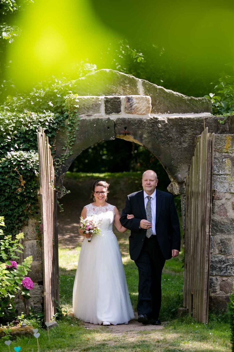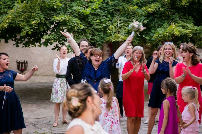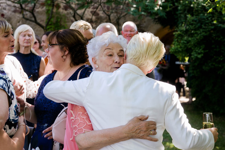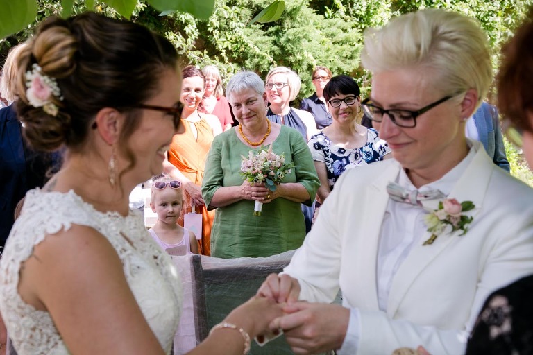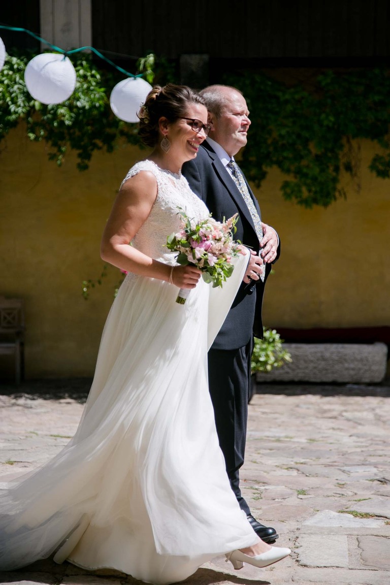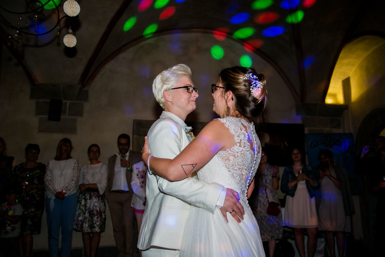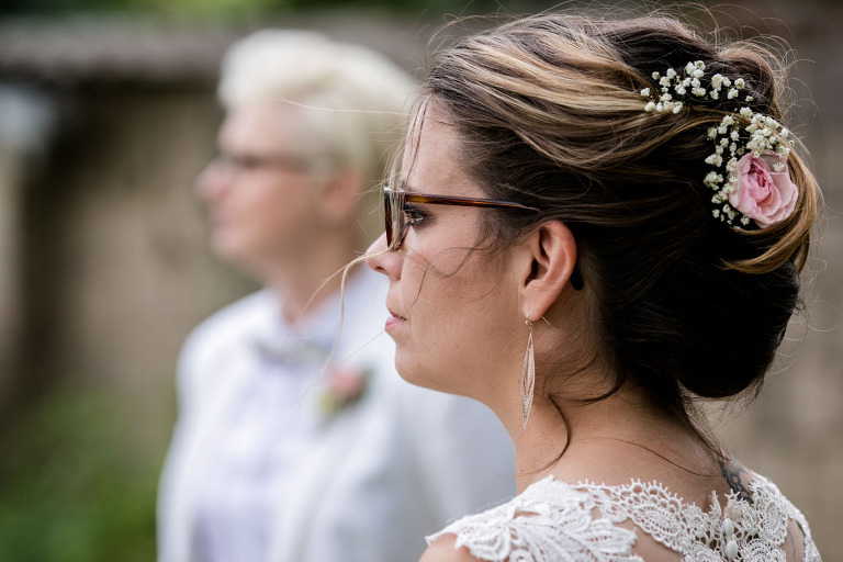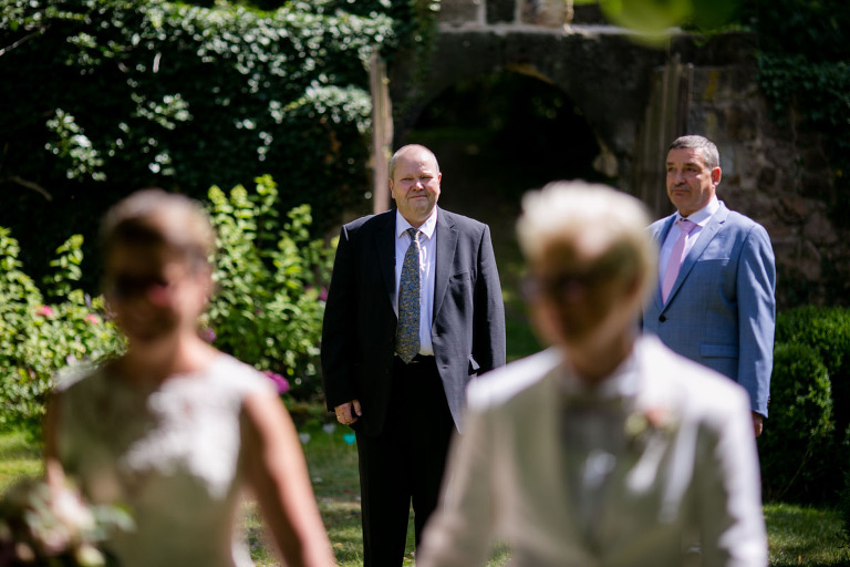 Soon after Corina and Selma booked me (Timm) as their wedding photographer, we met for a chilled shoot to get to know each other, which we include in the medium package for free. Those pictures could also be used right away for the invitation cards. Their big day finally happened in july last year at Castle Scharfenberg, a lovely rough, romantic, old castle close to Dresden owned by artists. The Getting Ready procedure in the wedding suite gave way to the first emotional blast: The two proud Daddies led their daughters to their first look to the castle courtyard and afterwards to the ceremony in the yard.