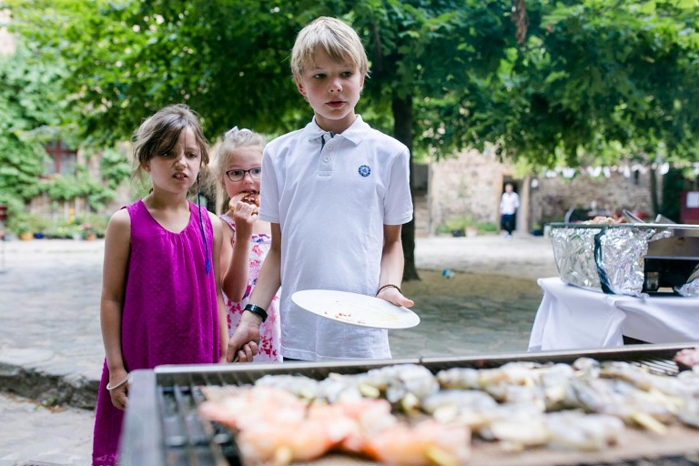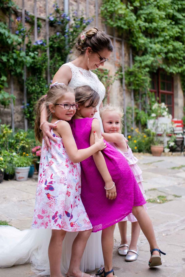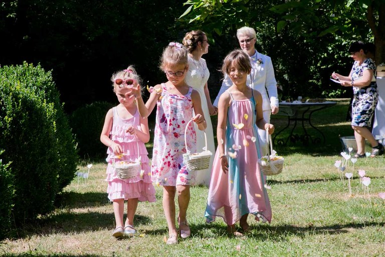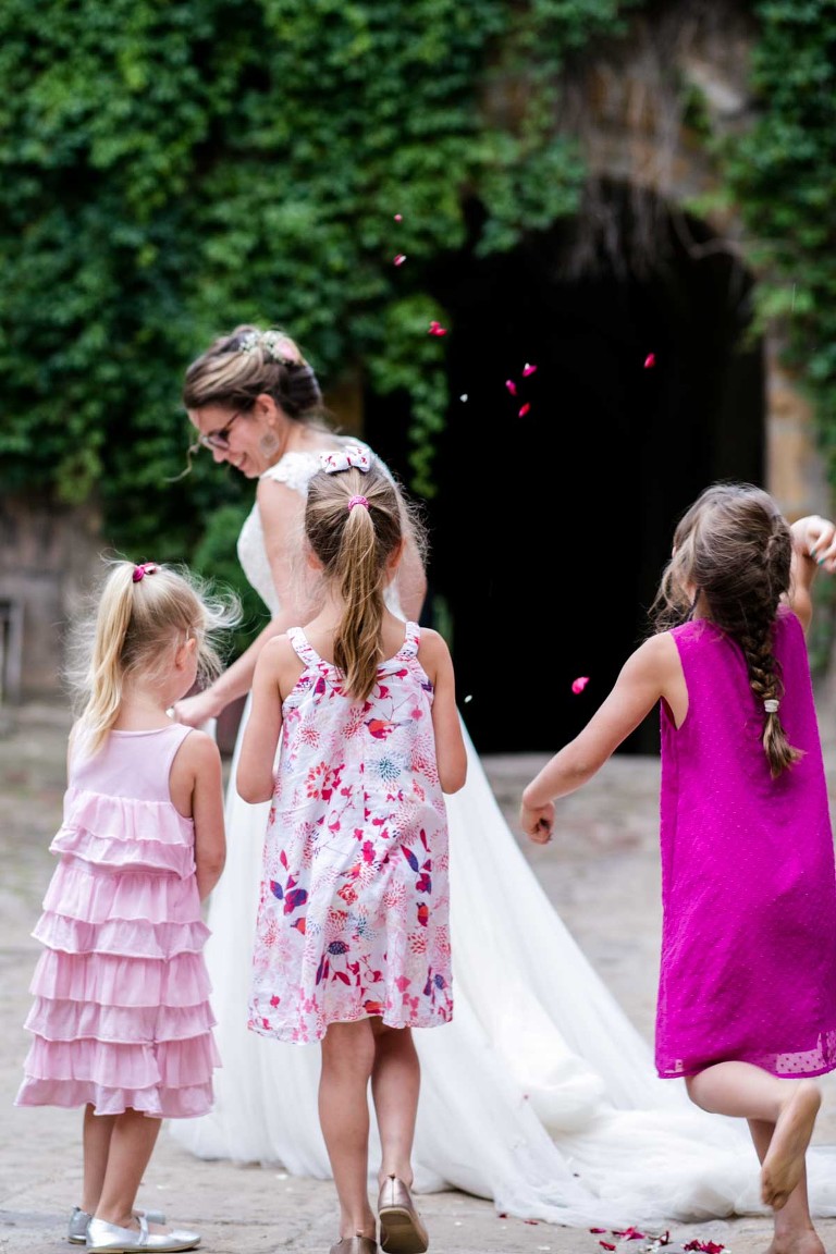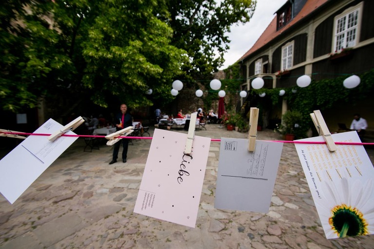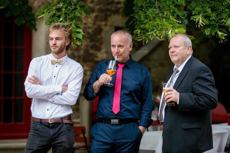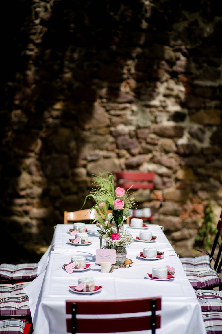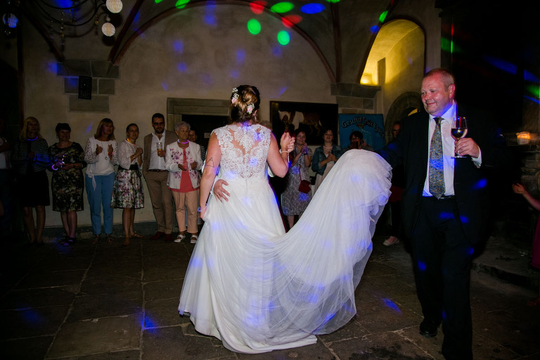 Soon after Corina and Selma booked me (Timm) as their wedding photographer, we met for a chilled shoot to get to know each other, which we include in the medium package for free. Those pictures could also be used right away for the invitation cards. Their big day finally happened in july last year at Castle Scharfenberg, a lovely rough, romantic, old castle close to Dresden owned by artists. The Getting Ready procedure in the wedding suite gave way to the first emotional blast: The two proud Daddies led their daughters to their first look to the castle courtyard and afterwards to the ceremony in the yard.