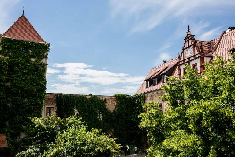 Der große Tag fand im Sonnenmonat Juli auf Schloss Scharfenberg statt. Einem wildromantischen, urigen Schloss in der Nähe Meißens, eine gute halbe Stunde von Dresden entfernt. Nach der Vorbereitung – dem Styling und Ankleiden – im Hochzeitszimmer kam der erste sehr emotionale Moment: Die beiden stolzen Papas führten ihre Töchter unter bewundernden Blicken zum First Look in den Schlosshof und danach zur Freien Trauung in den Garten!