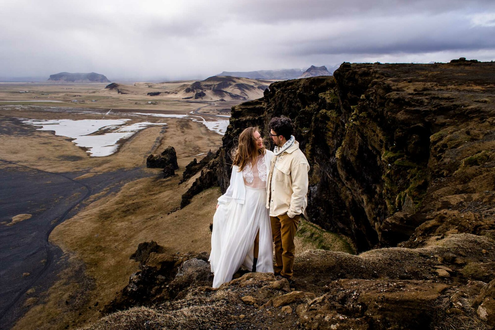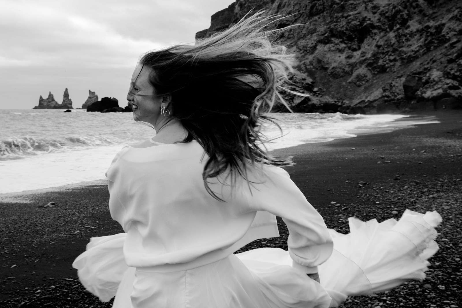 Wir waren für die Pre-Hochzeitsfotos an den verschiedensten Orten, an zwei unterschiedlichen Tagen. War der erste Tag noch ein wenig sonnig und fast warm, prasselte am zweiten Tag der Regen aufs Autodach, während wir die verschiedenen Locations ansteuerten. Zwei Motive waren mir persönlich am Wichtigsten: Ich wollte die beiden so gern Skateboard fahrend auf einer einsamen Straße fotografieren wie im Film „Das erstaunliche Leben des Walter Mitty“. Und ich fand die Basaltformationen sehr ästhetisch. Musste ich bei der gewundenen Straße nur die Autos im Blick haben, waren es bei den Basaltfelsen die an diesem Tag wirklich hohen Wellen, die aufgrund der Untergrundströmung auch gefährlich waren. Ich bin ein paar Mal gerannt, um nicht nass zu werden. Und musste jedes Mal aufpassen, nicht eine*n der vielen Tourist*innen über den Haufen zu rennen, die hinter mir standen und ein Hochzeitspaar natürlich auch super spannend fanden. Die beiden fuhren mit mir außerdem noch auf einen Berg, von dem aus wir den schwarzen Infinity Strand im Hintergrund hatten und danach direkt weiter zum Strand mit dem Wahrzeichen Islands hinter uns, nach Reynisdrangar bei Vik, wo es die drei Trolle zu sehen gab.