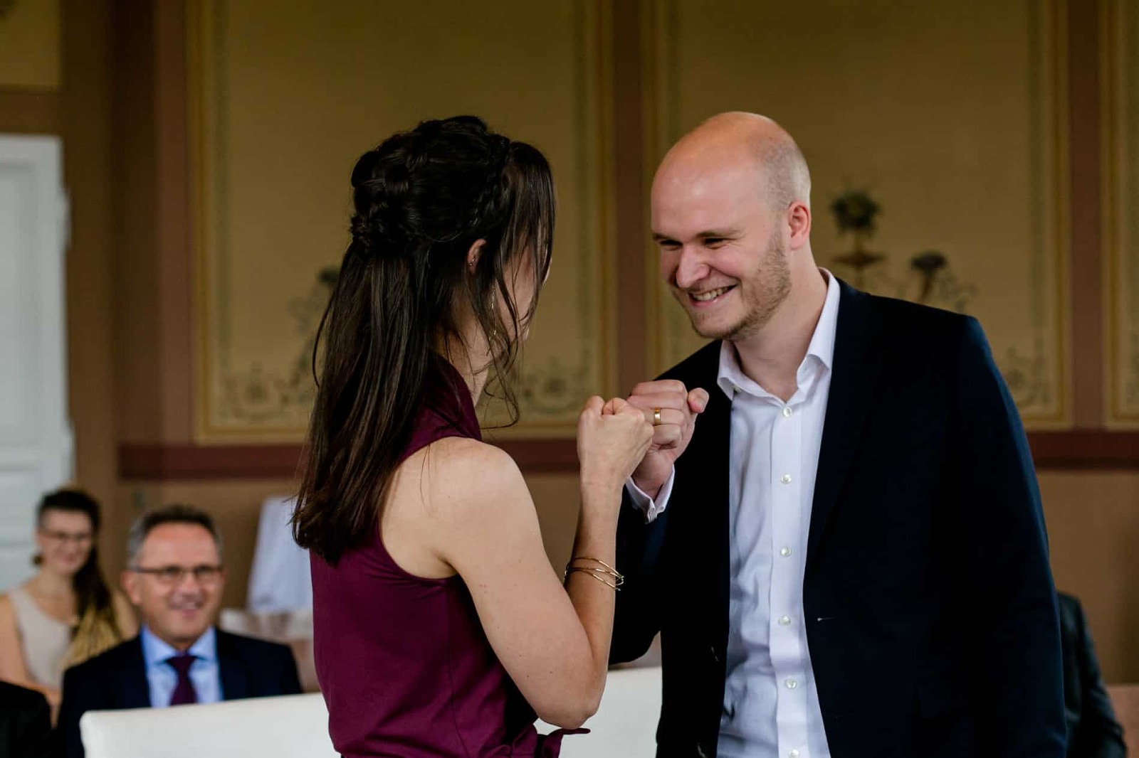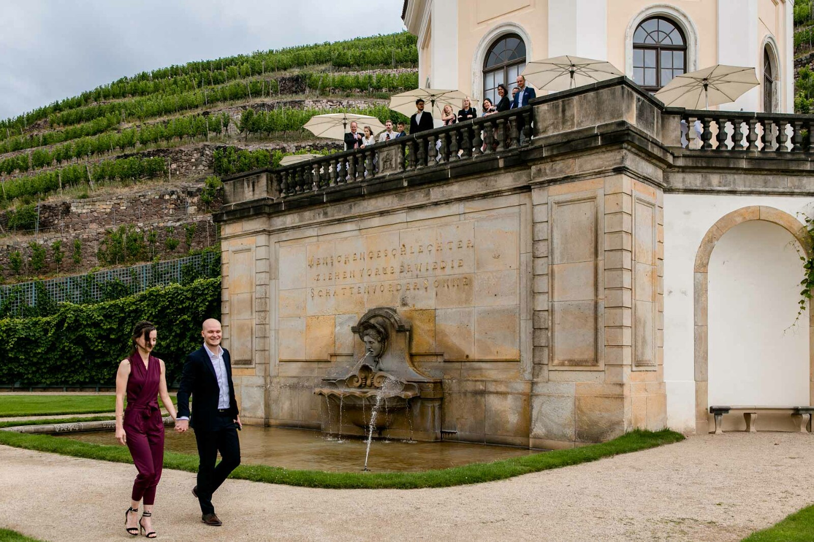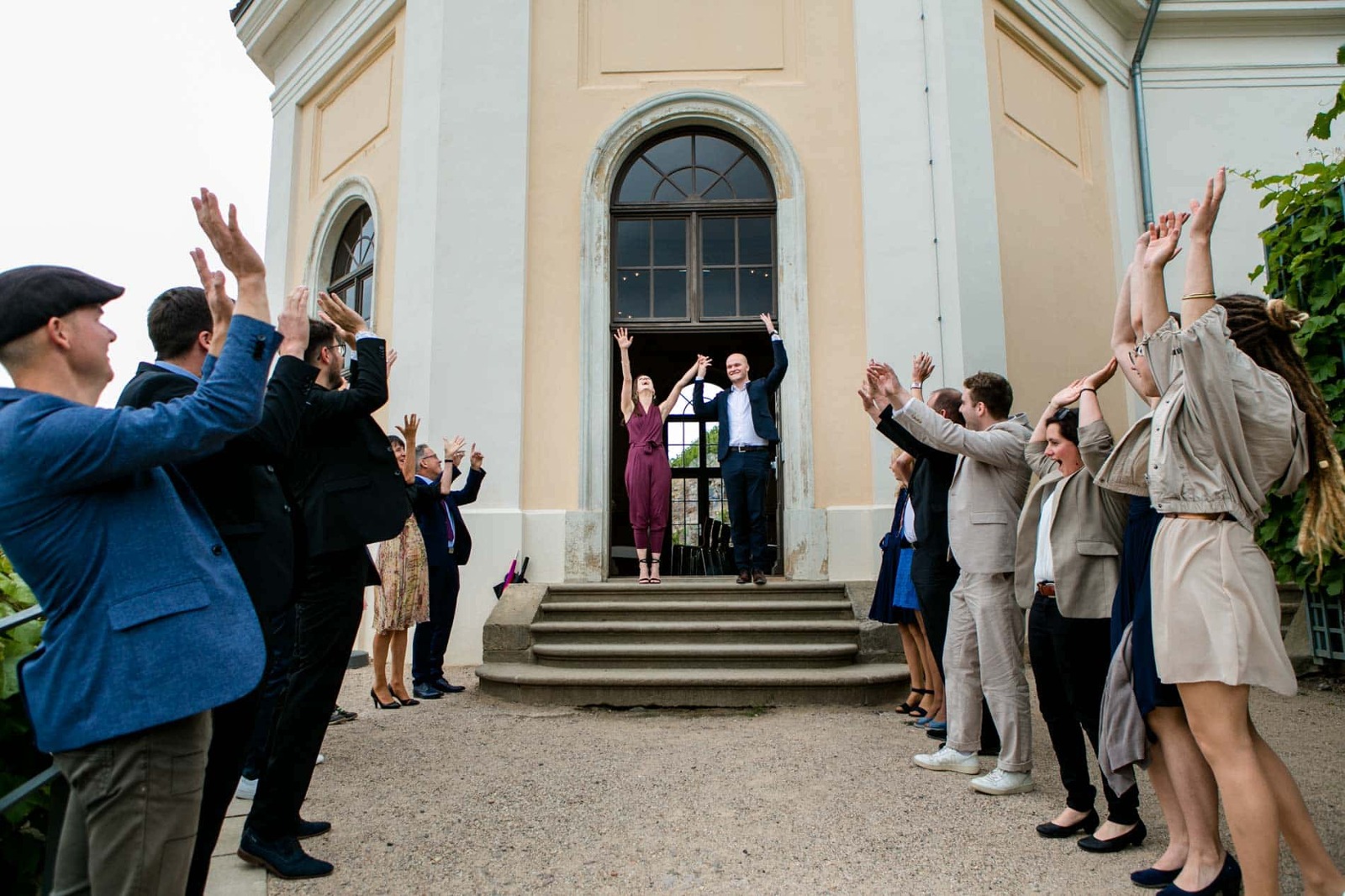Wenn ihr auf unserer Seite schon ein bisschen gestöbert habt, dann ist es euch evtl. aufgefallen, dass wir ein Faible für Hochzeiten haben, die nicht nach Schema F verlaufen. Wenn wir spüren, dass ein Paar den Wunsch hat, seine Hochzeit nach den eigenen Regeln zu feiern und dann auch noch den Mut aufbringt, die Ideen umzusetzen, dann schlägt unser Herz ein bisschen schneller. Diese Individualität ist oft weniger spektakulär, sondern findet sich in kleinen Elementen und Gesten, die ein wenig anders verlaufen am Hochzeitstag, als man es vielleicht erwarten würde. Langer Rede, kurzer Sinn: So war es auch bei Johanna und Martin. Die standesamtliche Hochzeit fand im Belvedere auf Schloss Wackerbarth in Radebeul statt. Es ging fröhlich und ausgelassen zu und ich (Judith) hatte großen Spaß daran, die Moves und Gesten von Johanna, die sie immer wieder zwischendrin ganz lässig einbaute, zu erwischen. Bei der Standesamtlichen Trauung waren die engsten Familienmitglieder und Freunde eingeladen. Da wir Fotografen am Datum der kirchlichen Hochzeit leider im Urlaub waren, entschieden sich die beiden, ihre Hochzeitsfotos im supercoolen Zweiteiler von Labude und geschneiderten Hochzeitsanzug vorzuziehen. Das war eine große Ehre für mich!