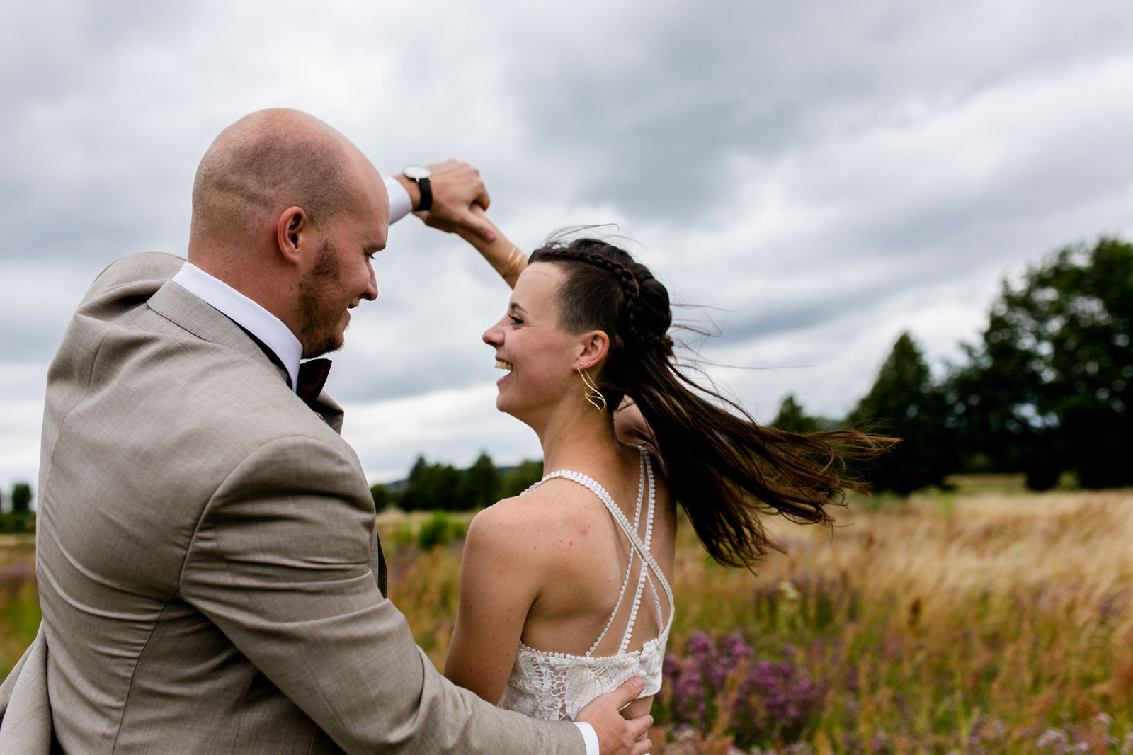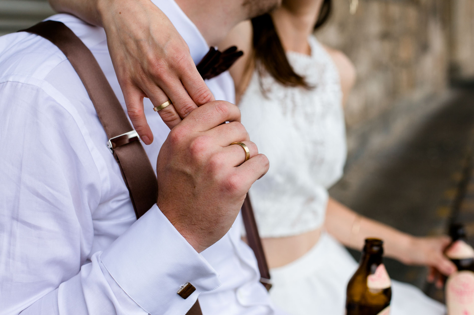 So fuhr ich mit dem Hochzeitspaar im Bulli zu verschiedenen Locations fürs Paarshooting. Mit dem Bulli war das Paar bereits auf etliche Touren durch Europa unterwegs und er war ihnen somit ein vertrauter Begleiter und bestes Hochzeitstaxi an diesem Tag! Auf dem Feld bei unserem ersten Stop schlüpften die zwei zunächst in ihre Hochzeitsklamotten für die kirchliche Trauung und große Feier. Sie halfen sich gegenseitig beim Ankleiden, es war lustig, ausgelassen und emotional zugleich. Die Fotos auf dem Feld bildeten den perfekten Gegensatz zu der industrial Szenerie mit Bierchen, Festivalkissen und Graffiti. Für die Paarfotos haben wir uns wirklich Zeit genommen und ich finde, das sieht man den Fotos auch an. Nicht immer ist das den Paaren so wichtig, aber wie sagt man so schön: Your wedding, your rules.